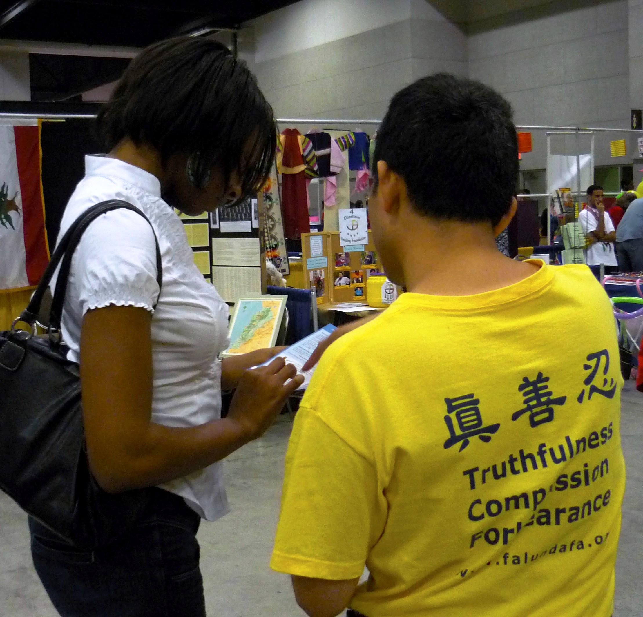 美国妇女企业主联合会公关部西蒙兹(Symonds)女士来到法轮功展位前,当听到中共对法轮功学员的残酷迫害后,感到很震惊。她立刻急切地问道,美国政府能做什么来制止迫害?学员告诉她,现在美国参议员提出了二三二号决议,要求中共当局立即停止迫害法轮功。她表示一定会关注此事,并留下了自己的名片。