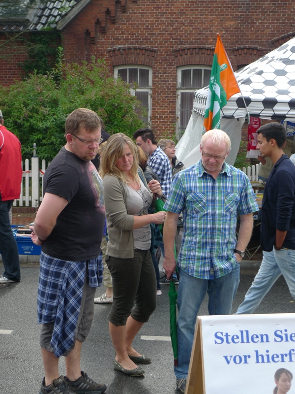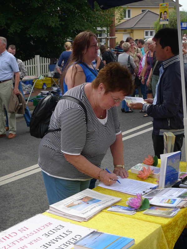 ![]() 游人认真阅读揭露迫害的展板 | ![]() 市场节上的游人签名反迫害 |