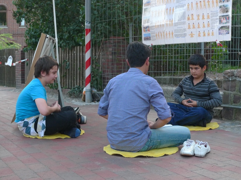 其中那位十岁的小男孩立刻提出想看法轮功创始人李洪志先生的著作《转法轮》。他翻开第一页,开始阅读《论语》。在和一位女法轮功学员的交谈中,他进一步了解到法轮功基本准则“真、善、忍”的内涵。他认同的点头,表情严肃并认真的思考着。年纪虽小,看起来他却真的听懂了大法弟子遵循的诚实、忍让和与他人和平相处的理念。“如果所有的人都能做到,那世界就和平了”,这男孩脱口而出。接下来他说,他也不希望发生争吵。即使他在学校里被打骂,他也不还手,而是宁愿转身走开。他认为法轮功“真、善、忍”的原则非常好。