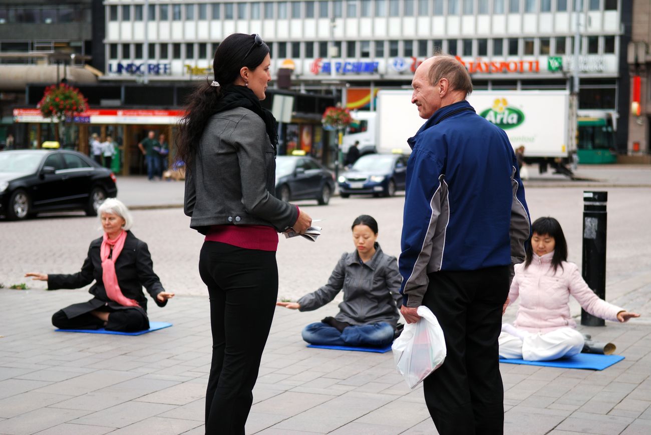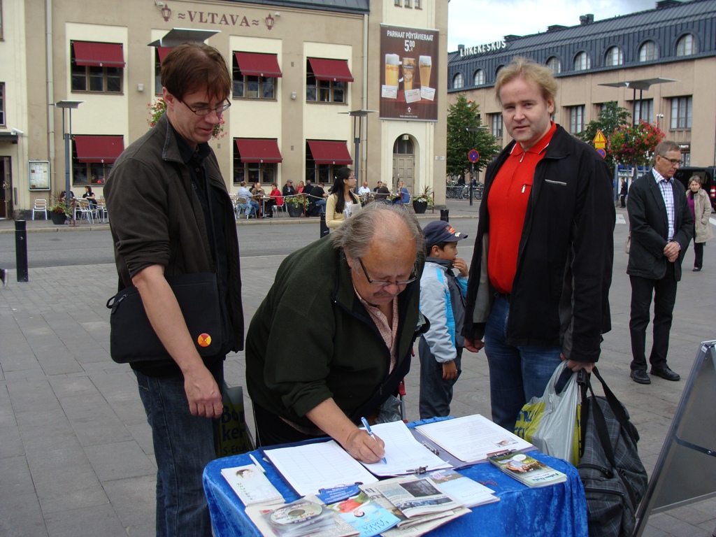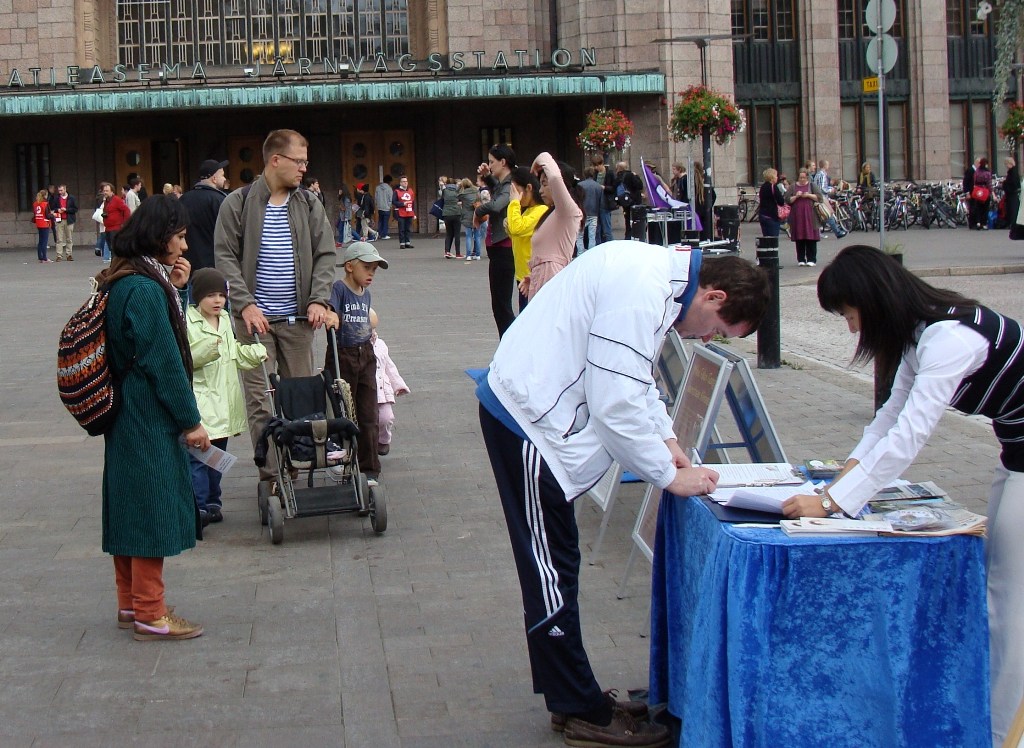 ![]() 芬兰法轮功学员在首都赫尔辛基市中心火车站广场设立讲真相点 |