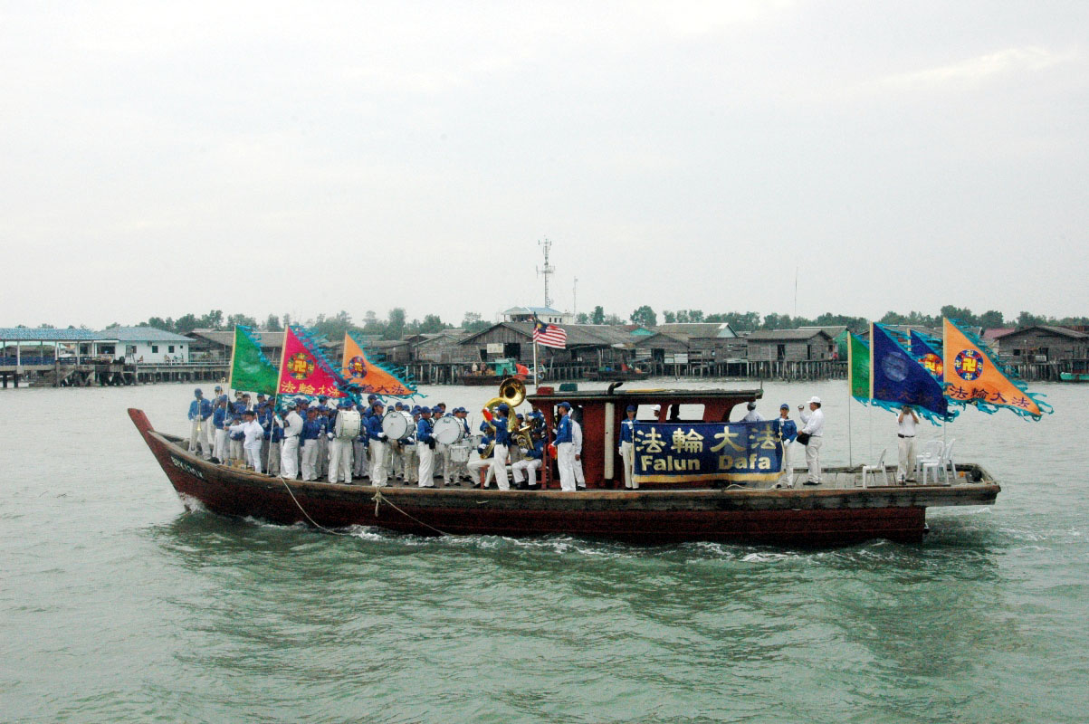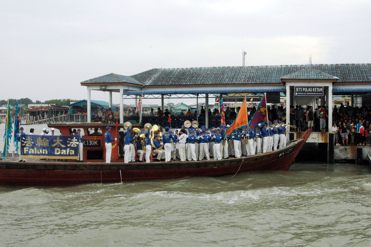 下午三时,天国乐团团员抵达了吉胆岛后,登上一艘以七彩缤纷写有“法轮大法”字样的旗子装饰的船只,开始了该乐团在船上演奏的首航。天国乐团在船上演奏着《法轮大法好》、《送宝》、《欢乐颂》、《法鼓法号震十方》、《法正乾坤》、《普世欢腾》、马来民谣《Rasa Sayang》等乐曲。嘹亮的旋律传遍了吉胆岛的多个角落,居民闻乐后纷纷赶出来观看,有的更兴奋地向天国挥手致意,更有游客追随赶来观看。