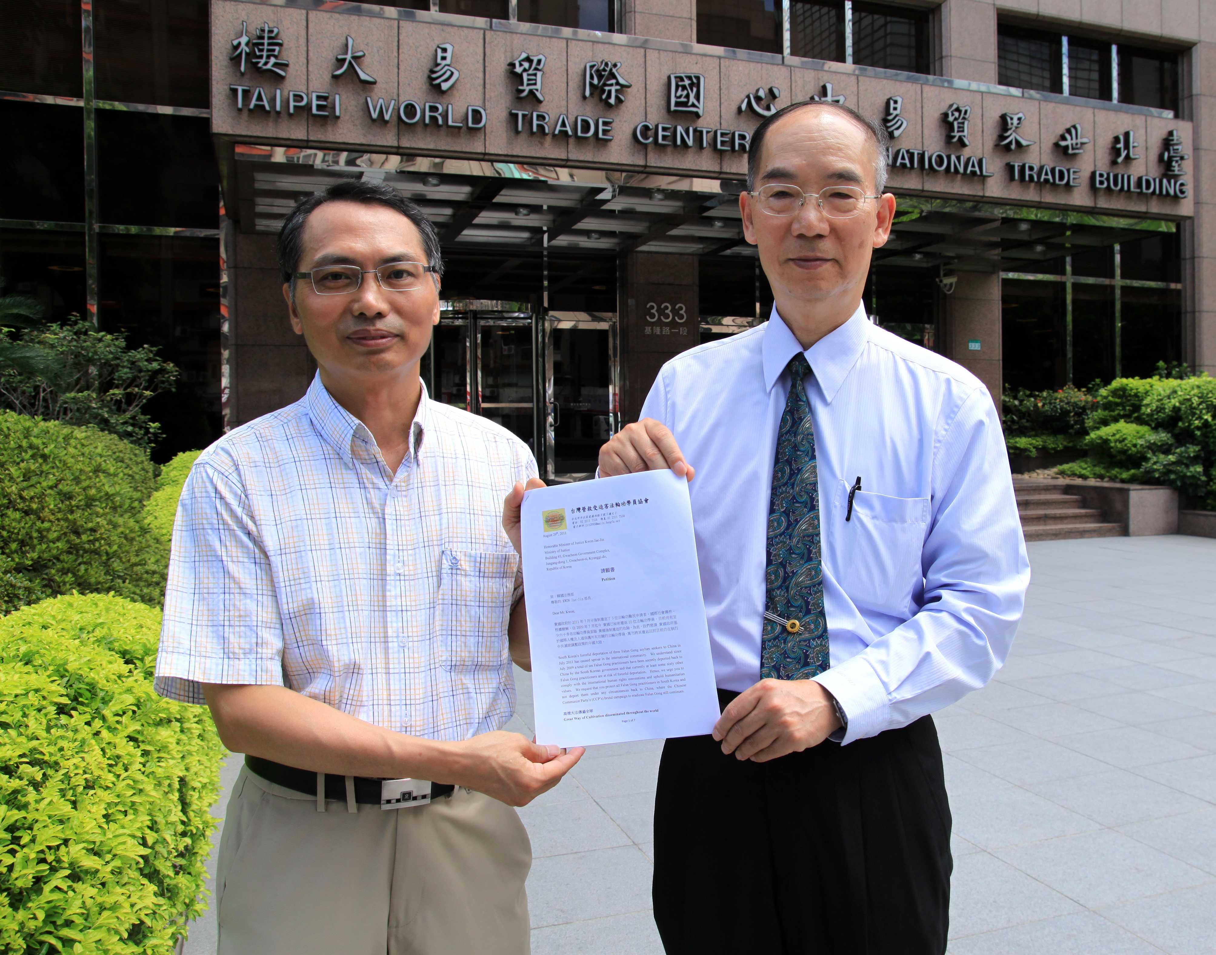 ![]() 台湾营救受迫害法轮功学员协会理事长萧松山(左)与副理事长戴瑞鹏,向驻台北韩国代表部递交请愿书表达抗议。 |