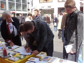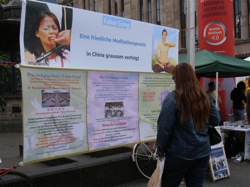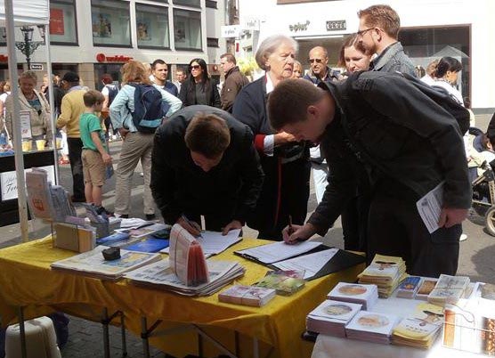 一位德国男青年径直走到征签桌前,用中文打招呼说“你好!”,就转成德文说:“怎么,在反对中国?”一个法轮功学员立刻给他解释说:“中共不是中国,我们反对的是中共对法轮功的迫害。”这位青年马上严肃起来,说“我知道,一直在迫害吗?”学员说:“是的。”这位青年已经拿起签名表签了他的名字,又用中文说“再见”并祝学员成功。
