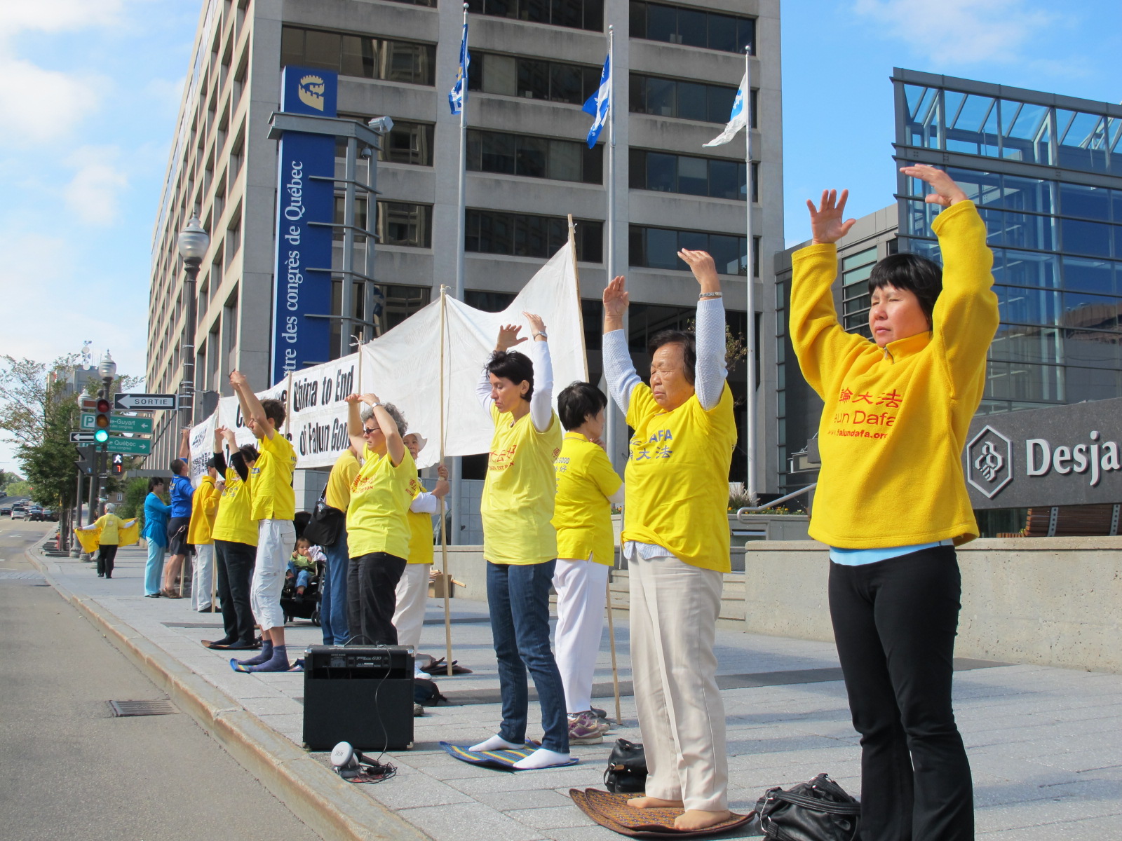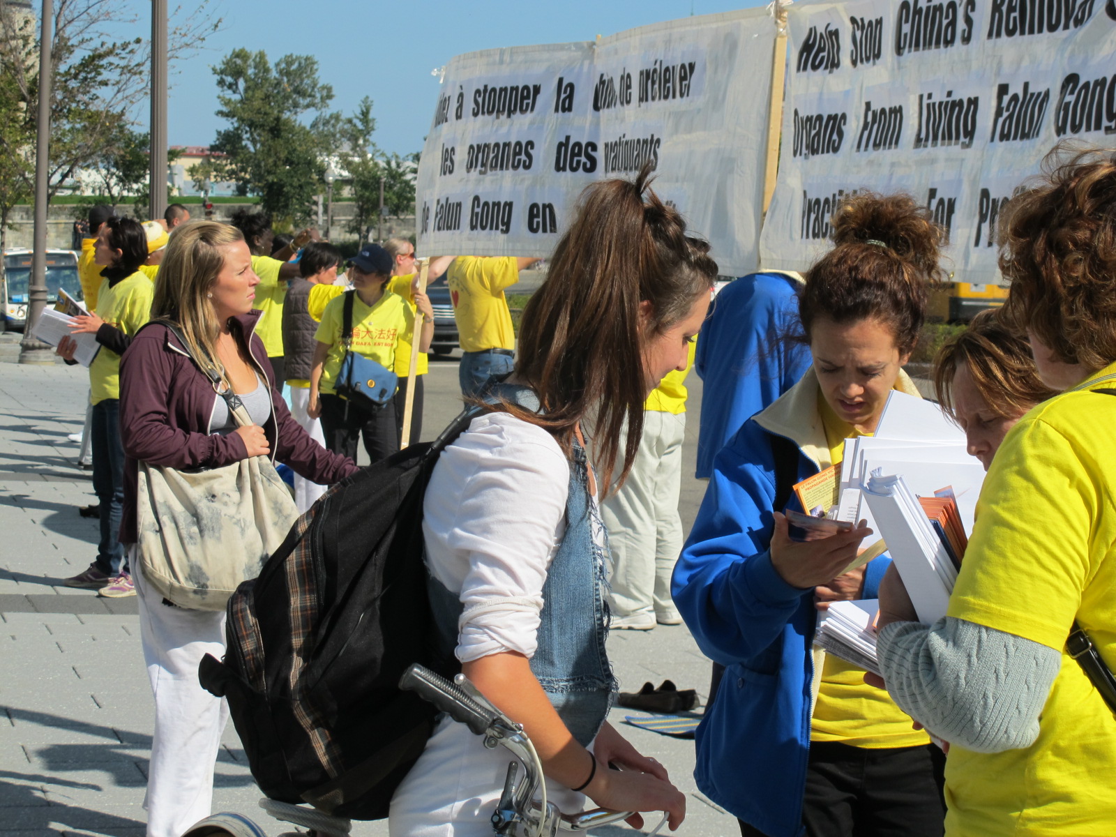 “请帮助制止中国活体摘取法轮功学员器官牟取暴利”(Help Stop China’s Removal of Organs From Living Falun Gong Practitioners for profit)这是九月二十四日来自蒙特利尔和魁北克的法轮功学员向与会者的呼吁,希望全世界人了解这件事情,不要在不知道的情况下参与到中共干的这种灭绝人性的事情中去,并请帮助制止这样的事情发生。