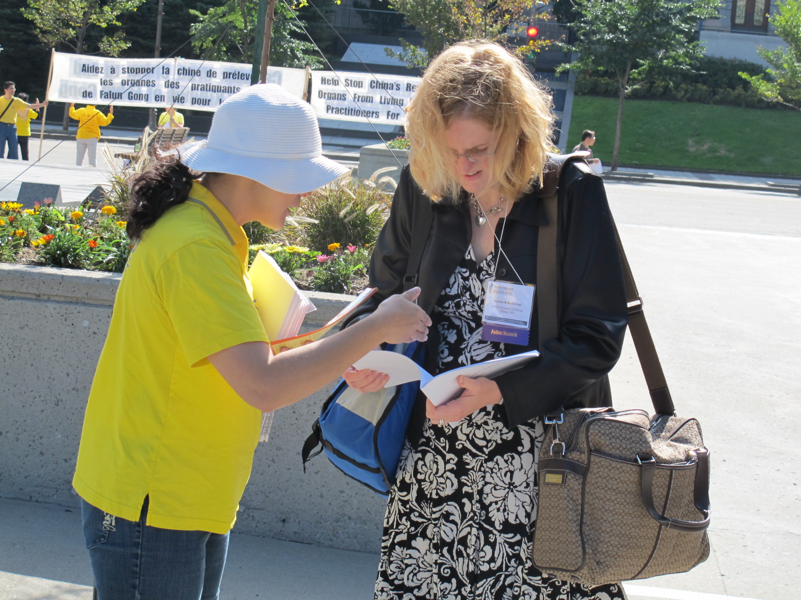 来自加拿大阿伯塔大学的一位年轻女士告诉法轮功学员,她不是医生,她是为医生做辅助性工作的,她请求法轮功学员允许她将《活摘器官调查报告》复印更多本,她想送给她服务过的所有医生。