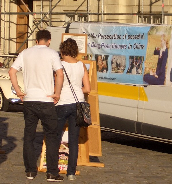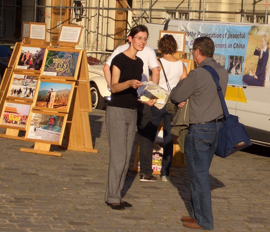 也有不少参加会议的华人把《·九·评*共产党》和法轮大法的资料装到自己的包里,有的一边走一边阅读。有位华裔女翻译还向她的外国同事用英语解释:《·九·评*共产党》是揭露共产党邪恶的一本书。她的外国同事听后也欣然地接过了法轮功学员赠送的法轮大法外文资料。