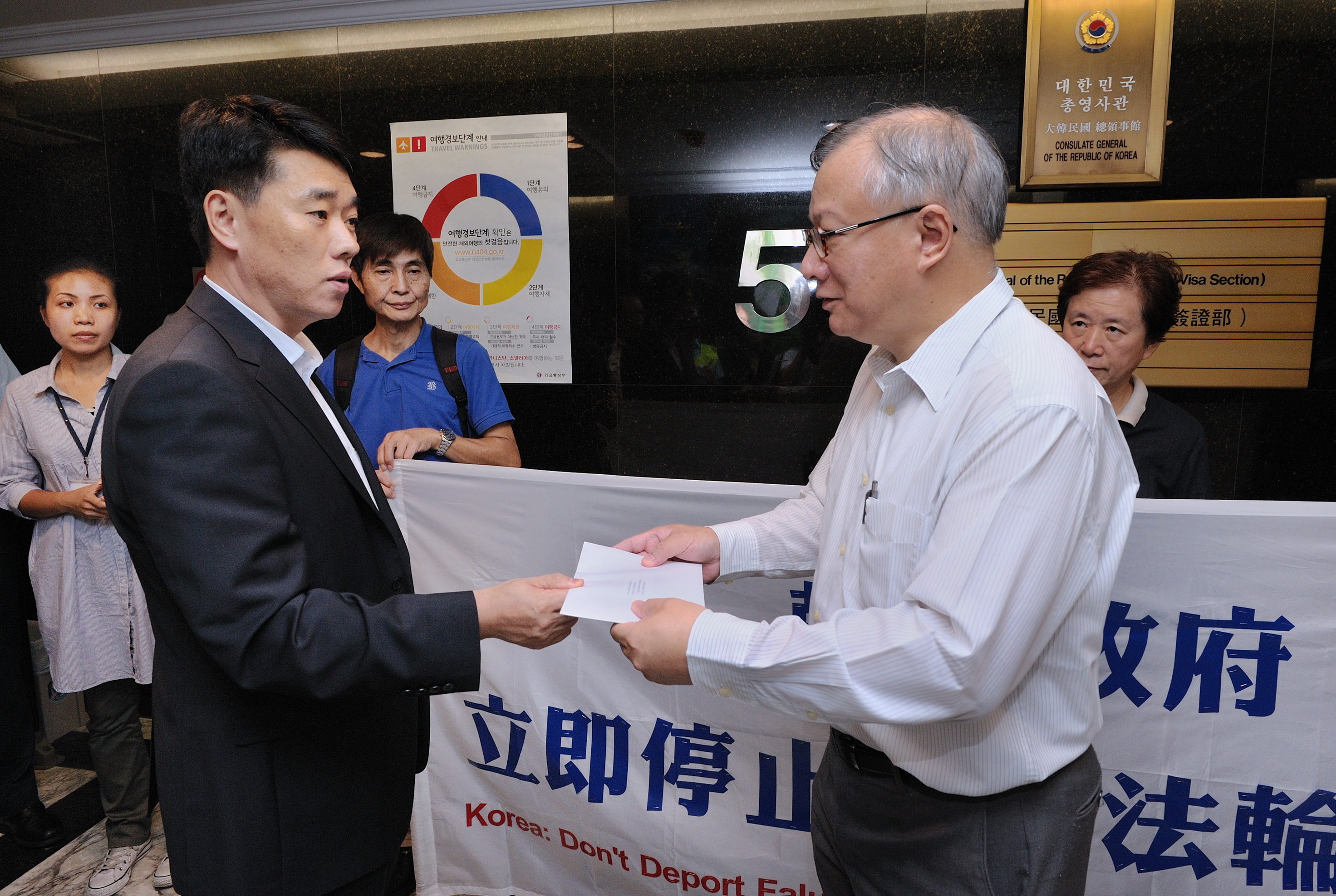 ![]() 南韩领事馆领事朴光柱(前左)接收香港法轮功学员致南韩总统李明博的声明信函。 |
