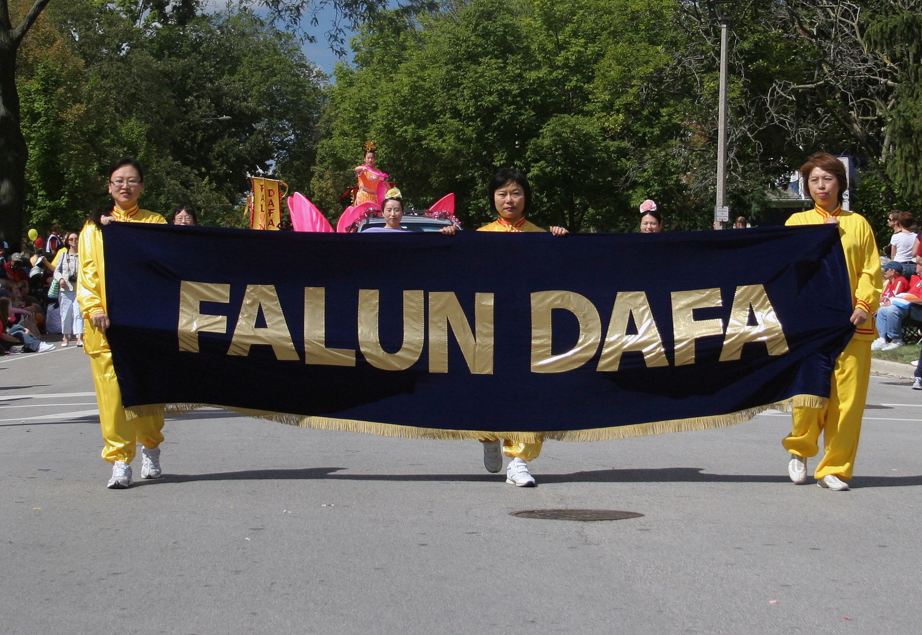 ![]() 法轮功学员打着英文“法轮大法教导真善忍、身心修炼”的横幅 |