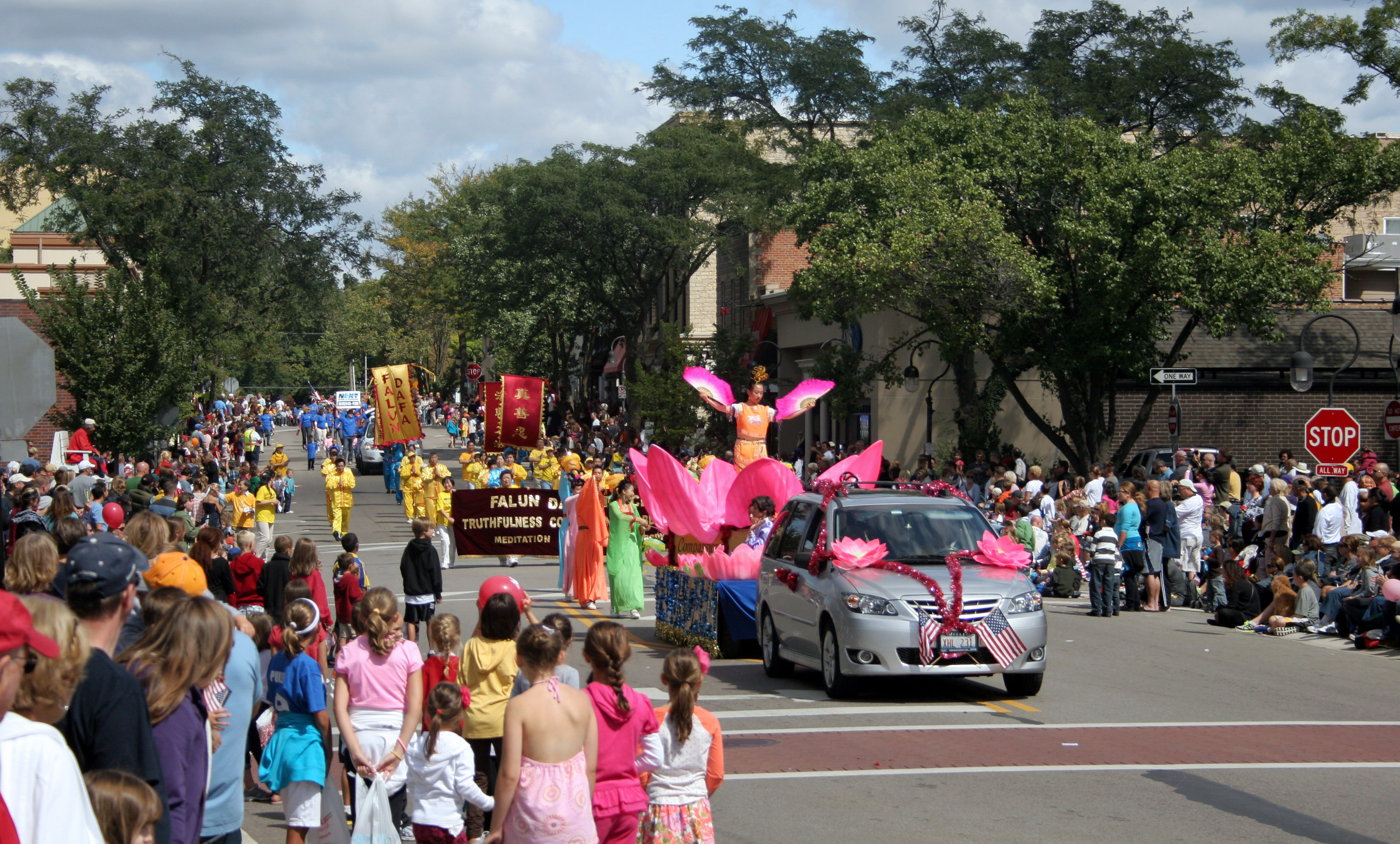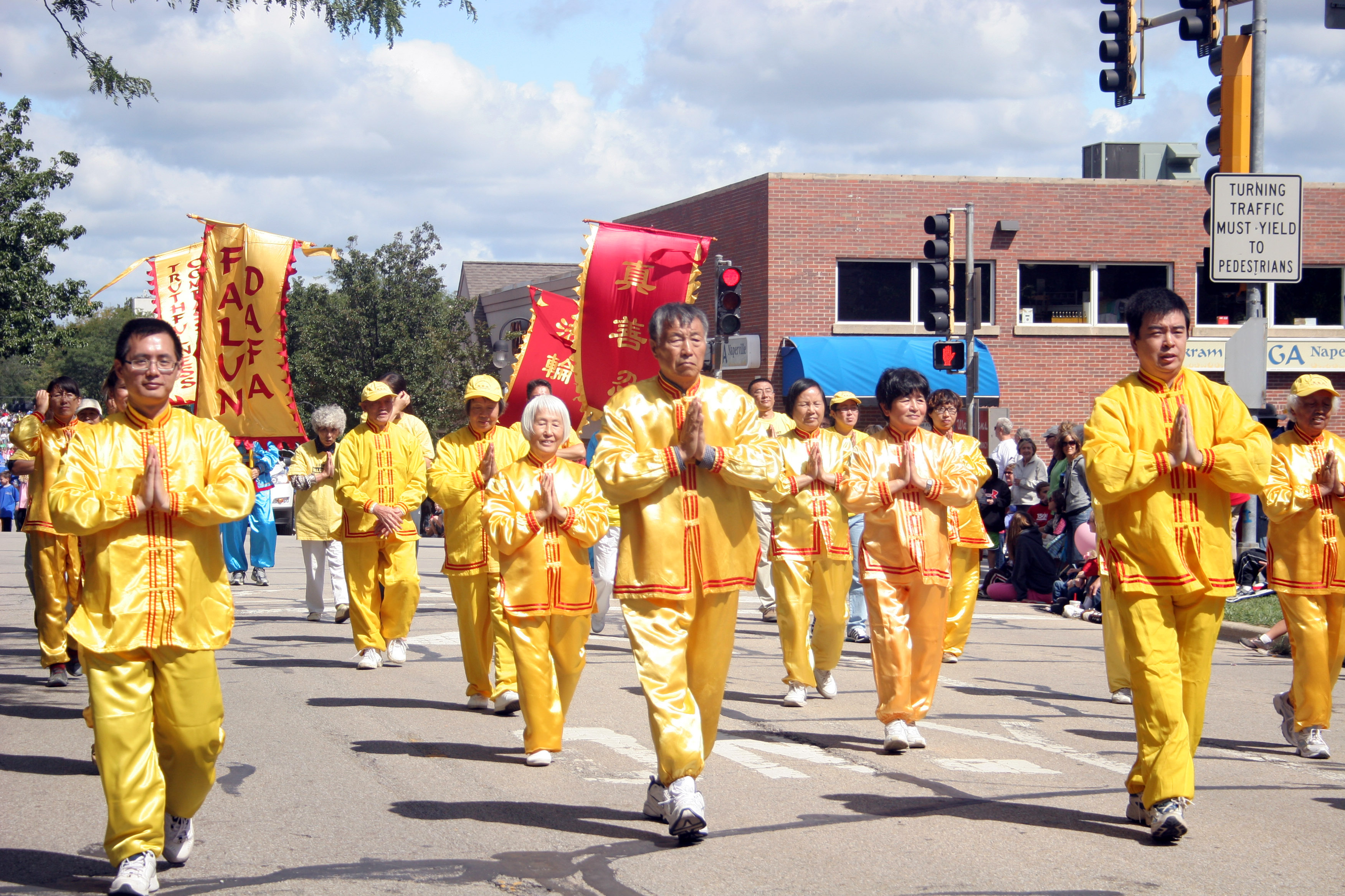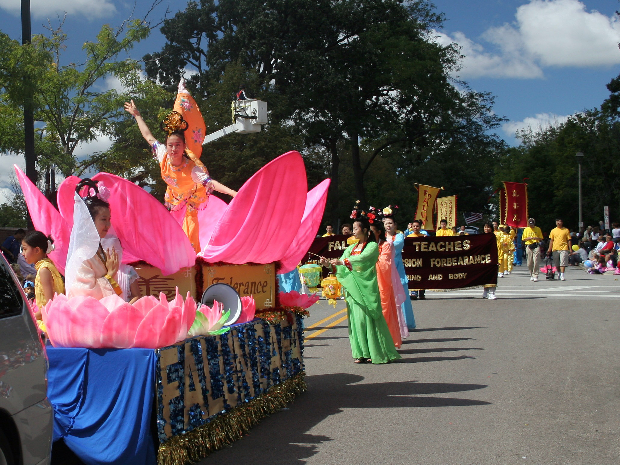 法轮功队伍经过主席台时,两位主持人向观众介绍道:“这是来自美中法轮大法学会的队伍。法轮大法也叫法轮功,是一种古老的民间修炼方法,通过锻炼和打坐来改善身心。”主持人接着说:“法轮大法是世界上最受欢迎的修炼方法之一,在一百多个国家有上亿人修炼,不收取任何费用,简单易学。”一位主持人边介绍边表示赞叹:“真是太美了!”他继续介绍道:“法轮大法教导人们遵循真、善、忍的原则。”另一位说:“看到他们,我自己也感觉很平静祥和。”