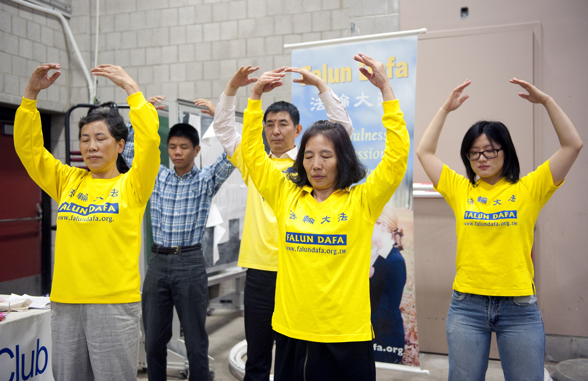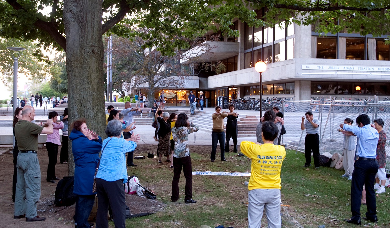 当天下午,法轮大法俱乐部的成员二十多人在学校正门前的草坪集体炼功,成为一道亮丽的风景线。游客中有为数众多的从中国大陆来的,他们看到法轮功学员在草坪上自由地炼功后,非常震惊;有些大陆游客表示他们在台湾、香港等也曾看到法轮功学员集体炼功的场景。