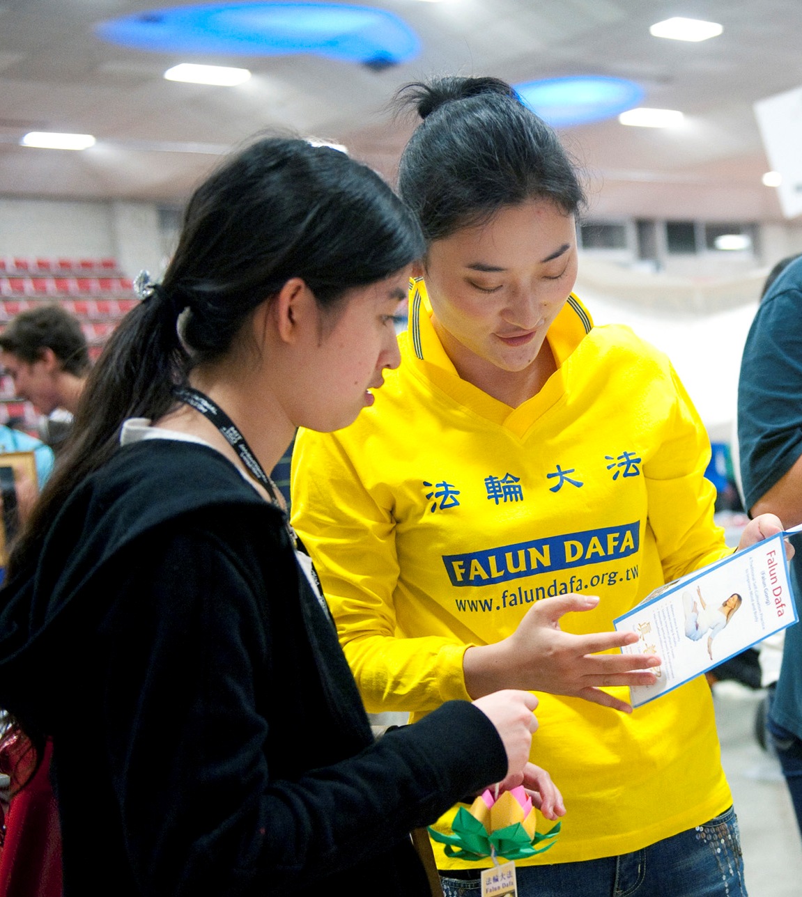 前来展位的大陆学生表示对法轮大法的支持。其中一位大陆学生对学员说:“谢谢你们的付出,加油加油。”她表示在国内就了解法轮大法真相,并且很佩服法轮功学员在迫害面前不放弃信仰的精神。