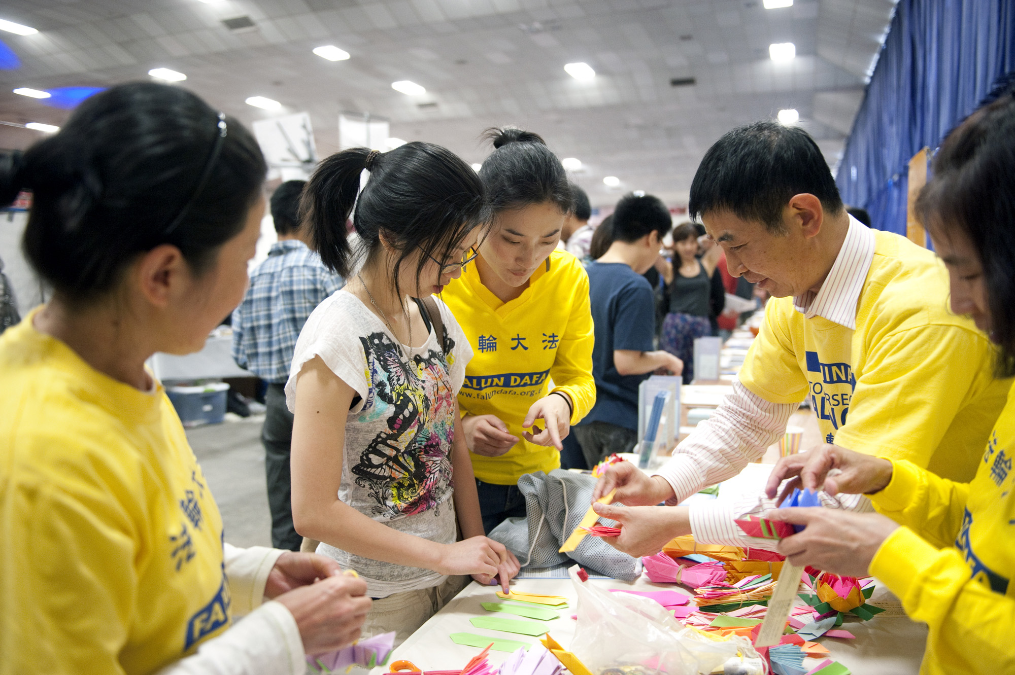 法轮大法俱乐部的成员还现场教大家折纸莲花。很多新生好奇地问纸莲花的内涵。俱乐部的杨同学说:“莲花生在淤泥中,但是她出淤泥而不染,在中华文化中象征高洁。法轮大法弟子用莲花象征在中国大陆、在迫害和谎言中,大法弟子坚持信仰,坚持‘真、善、忍’的高洁品质。”