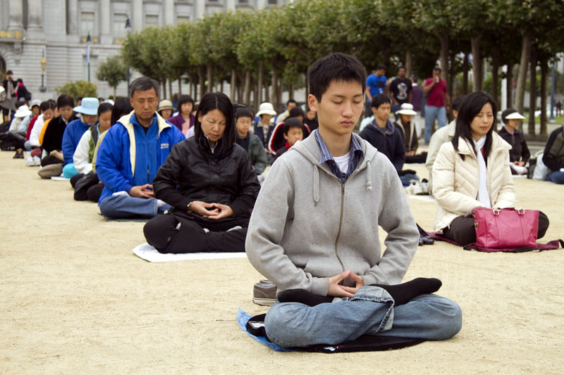 旧金山市政厅广场周围环绕着旧金山市府大楼、加州州府大楼、亚洲博物馆、市立图书总馆、旧金山管弦乐团,是著名旅游点,游人必到之处,每天都有一拨接一拨的中、西方游客到此游玩观赏。当天,前来参加大炼功的法轮功学员中,有华人、也有西人,有硅谷工程师、博士、医生、老人,也有学童……伴随着悠扬的炼功音乐,整个炼功场面宁静祥和,吸引了不少行人驻足观看。