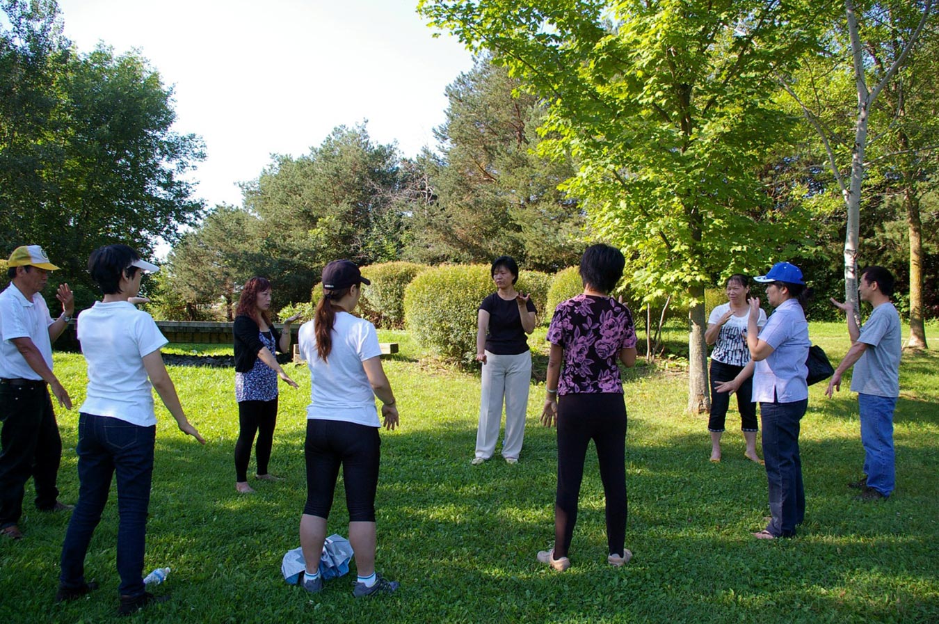 十五年前,法轮功学员开始每个周末在这里集体炼功,并提供免费教功服务。这是法轮功传世十九年来的典型传播形式:人传人,心传心。