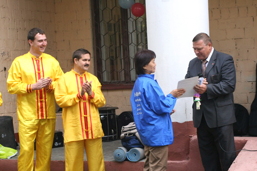 表演结束后,学员向到访莫斯科的特维尔市政府负责人讲述了法轮功真相,以及在中国正在发生着的中共对法轮功的迫害。该负责人深表感叹,他代表市民和学生向莫斯科法轮功学员表达衷心的祝福与谢意,并颁发给莫斯科法轮功学员节日奖状。