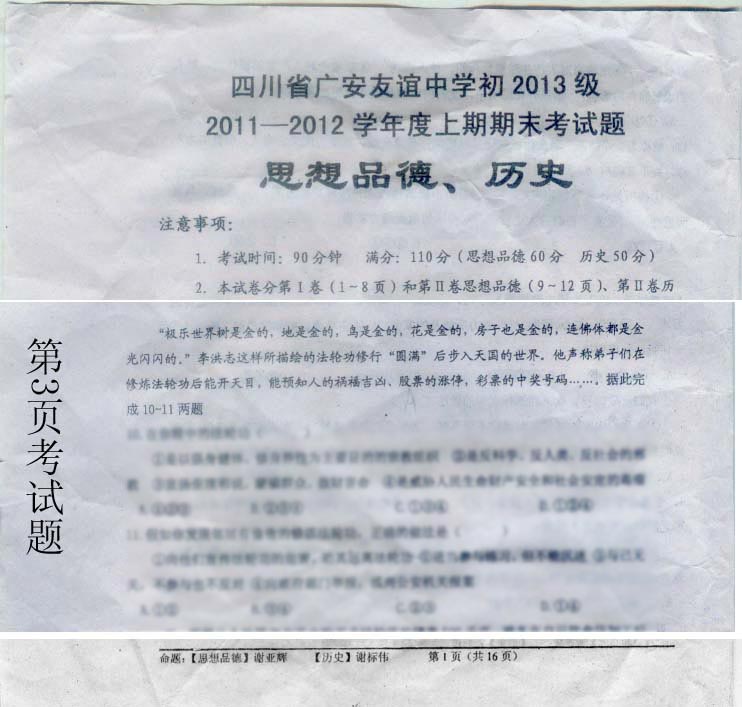 附:中共政治打手强迫考生诽谤法轮功、教唆学生作恶的考试题