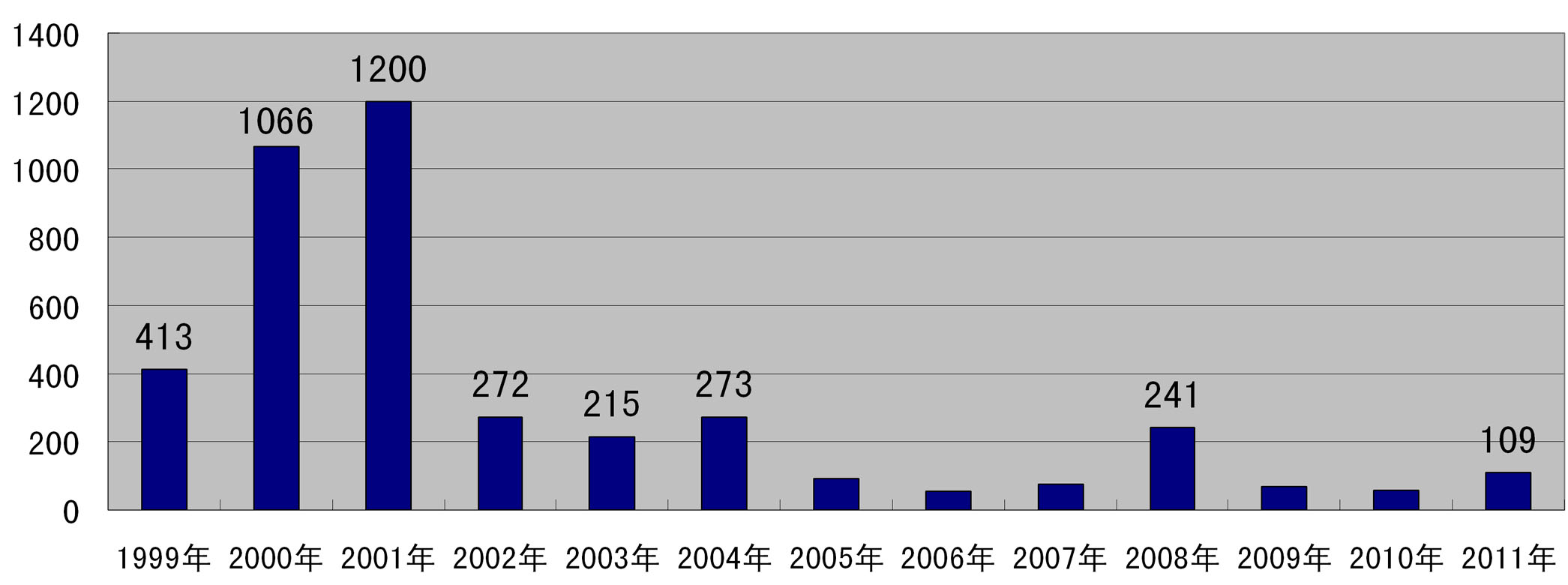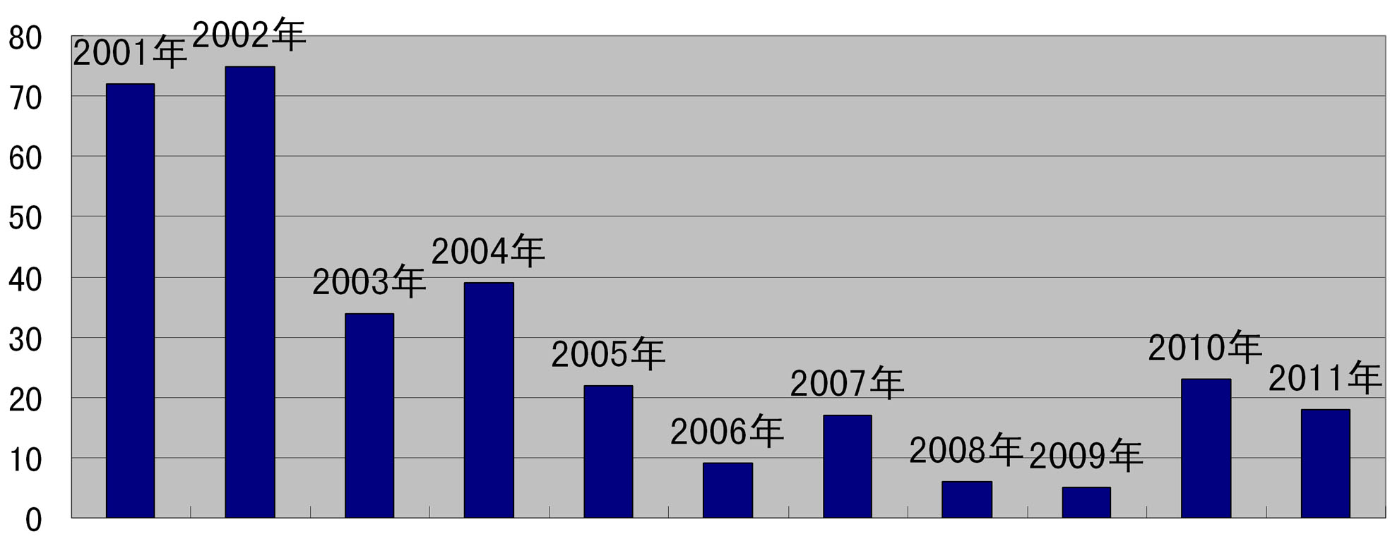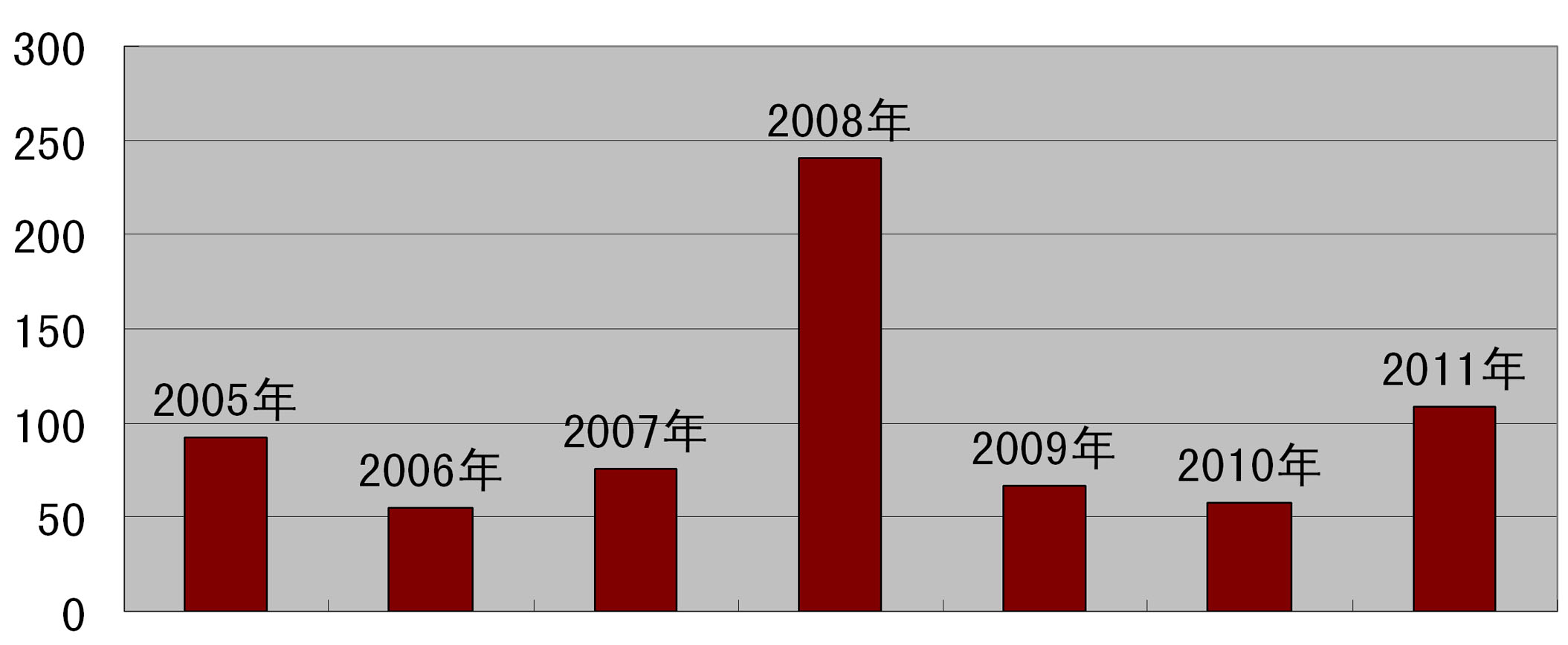 ![]() 2005年-2011年石家庄地区被非法抓捕法轮功学员统计表(纵轴为人数) |
