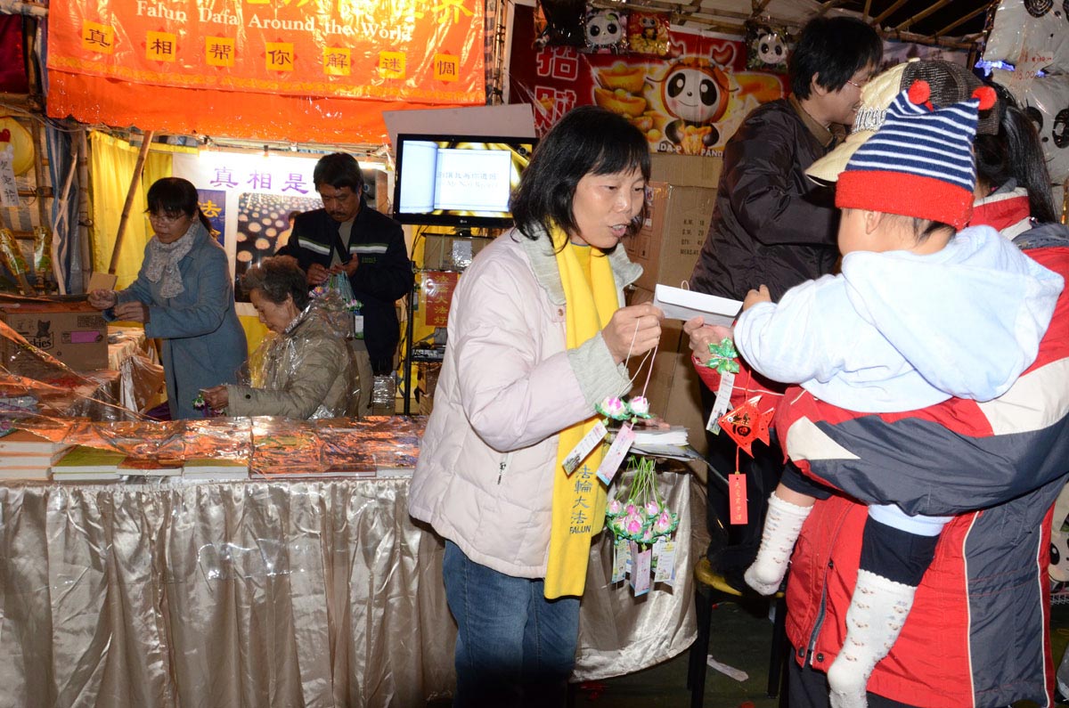 ![]() 法轮功学员在年宵摊位前向市民派发真相资料 |