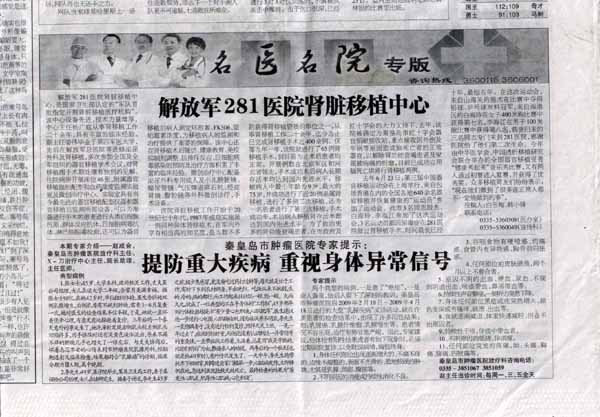 《秦皇岛晚报》(2009年12月18日星期五)11-B版 刊登的《解放军281医院肾脏移植中心》这篇报道中说:从1987年到今天已经做400例肾移植手术;仅2009年该院就进行了65例肾移植手术(大约每周1.3例,其供体来源不明)下面把(2009年12月18日星期五)《秦皇岛晚报》扫描片(一版分两次扫描)一同传去,作为参考据。
