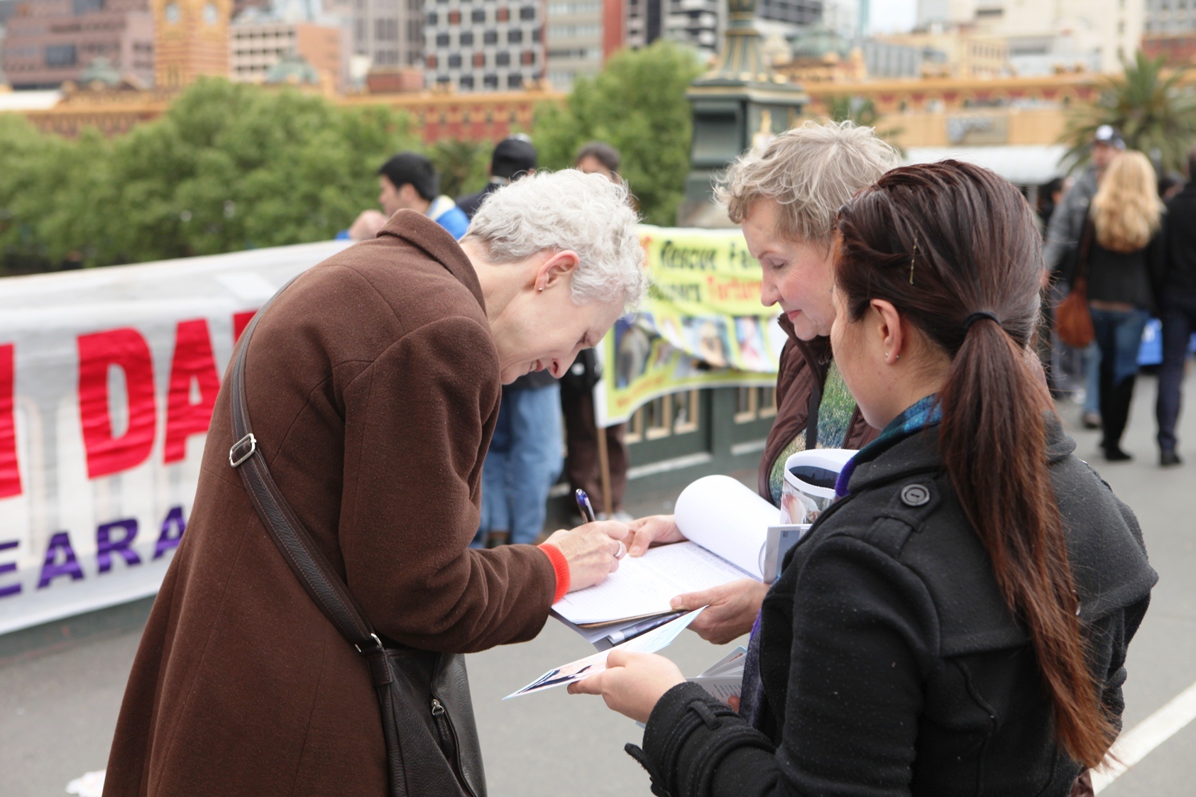不少澳洲人都知道法轮功在中国被迫害的事实,但是对中共活摘法轮功学员器官的罪行还是头一次听到,他们表示很震惊,不敢相信还有这么惨绝人寰的事情。同时,他们都很佩服法轮功学员站出来揭露这些暴行的勇气,并主动在反迫害征签本上签名。