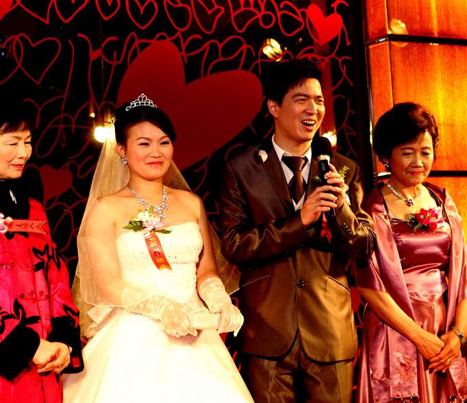 ![]() 詹花微(右一)的儿子与媳妇都修炼法轮功,他们在婚礼上展现大法的美好,并给宾客播放“介绍神韵”的影片。 |