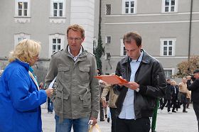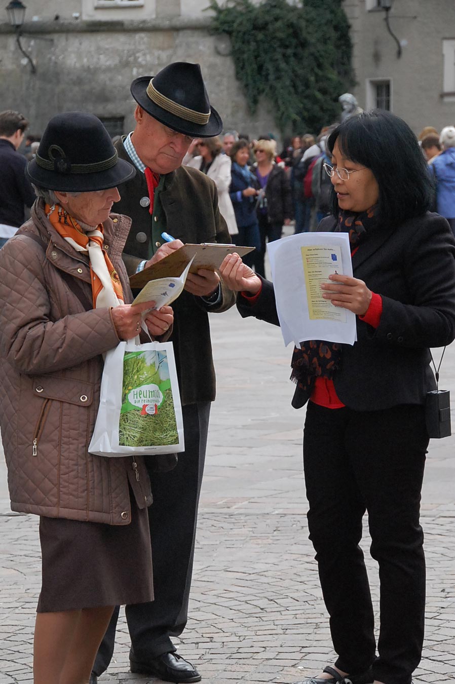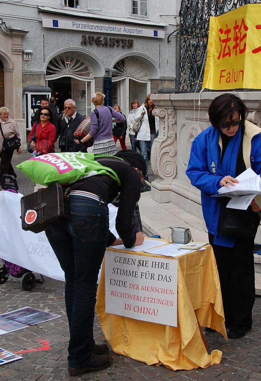 ![]() 奥地利萨尔斯堡老城市中心广场上,人们纷纷签名谴责中共活摘器官暴行 |
