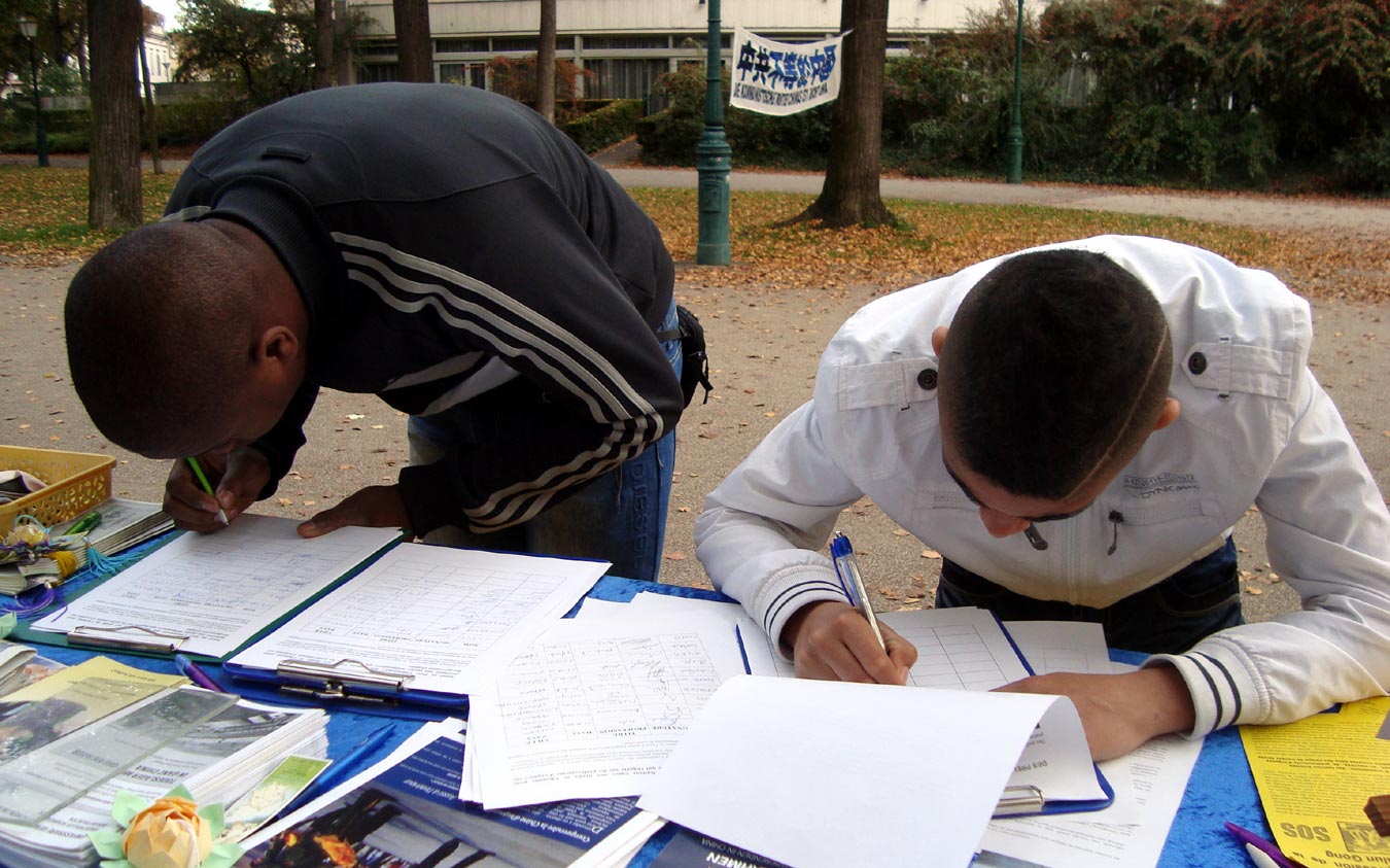 活动结束前,两个非洲裔的年轻人跑来签字。他们说,刚才伙伴们签名时,他们没在。看了接到的资料后决定过来补签。矮个的说,他们刚才一直在议论这件事,太恐怖了!高个的说,他们随父母来自战乱的非洲,祖国充满了贫穷、饥饿、暴力,但是没听说政府贩卖人体器官。他问“活摘”是什么意思?听了学员解释后,两个小伙愣了好一会,