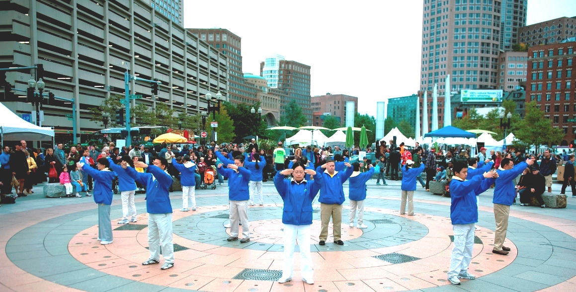 ![]() 路人和游客在波士顿市中心驻足观看法轮功学员功法示范。 |
