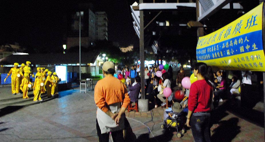 文化公园位于嘉义夜市旁,是嘉义市最大、最热闹的公园,大陆游客必游之地,每逢假日或是晚上,都会聚集许多民众。这个晚上,明慧学校小弟子们拿着印有“法轮大法好”的气球穿梭在民众中。在石椅前,一位小弟子将气球送给一位市民,告诉他“法轮大法好,真善忍好”,这位先生高兴地接过了气球。