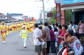 由天国乐团、灯笼队、仙女队及腰鼓队阵容组成的法轮功庆中秋游行队伍,于下午五时在警方协助开路下浩荡出发。这是法轮功学员首次来到昔加末,亮丽整齐的游行队伍吸引了许多沿途的居民从屋里出来观看,纷纷拿起手机摄录游行过程。