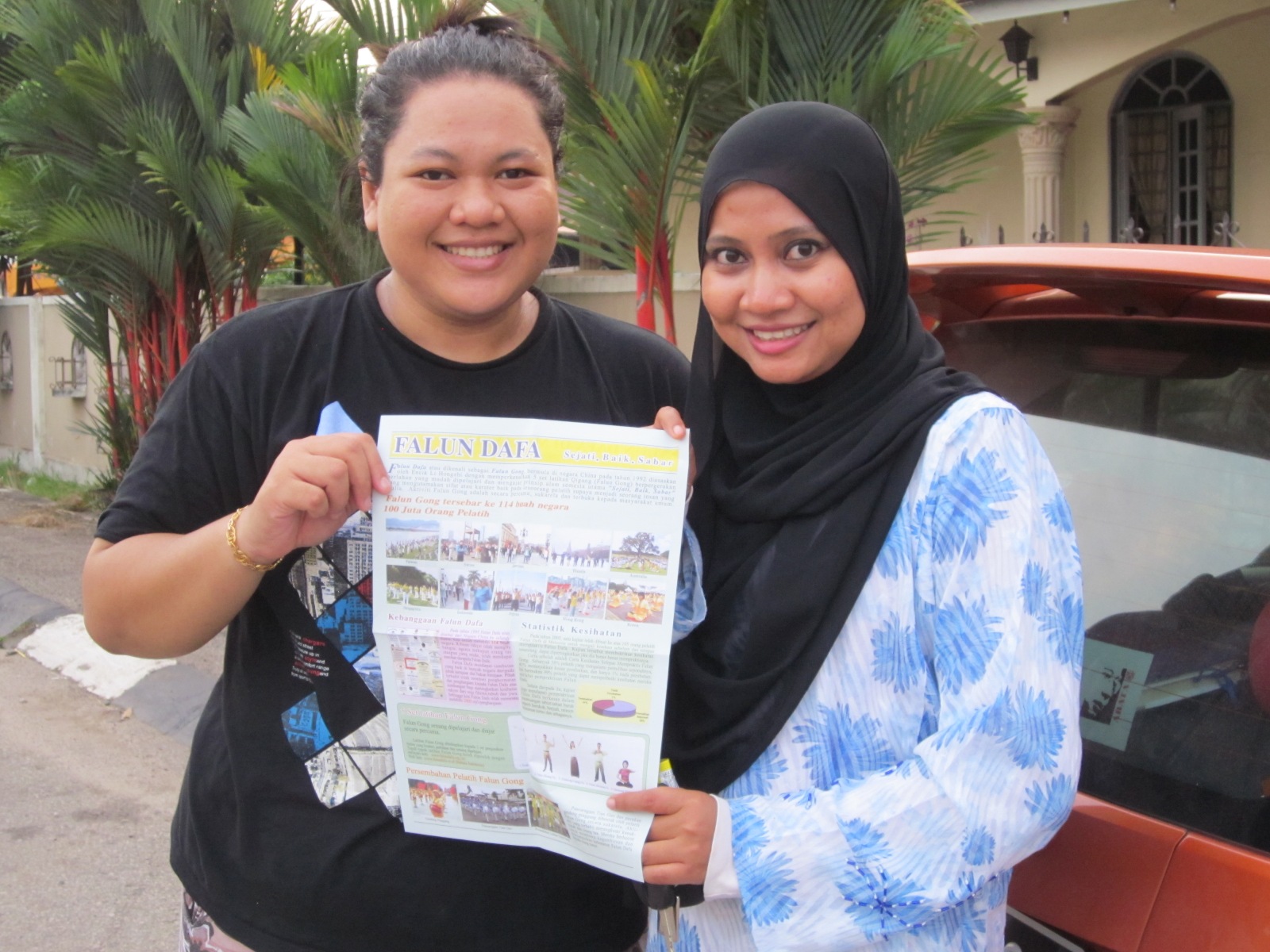 马来女子法拉和法蒂玛是朋友,两人今年都是二十六岁。法蒂玛趁着周六空闲时间到法拉家探望她,刚巧碰上法轮功的队伍经过,有幸观赏了游行。两人表示很高兴认识法轮功。