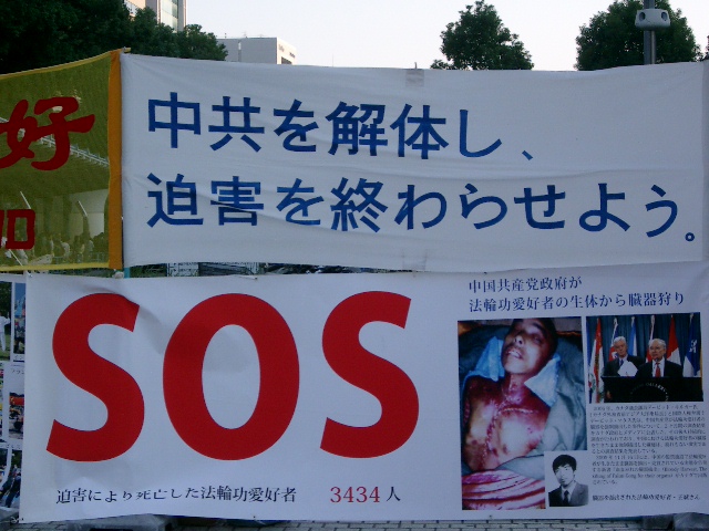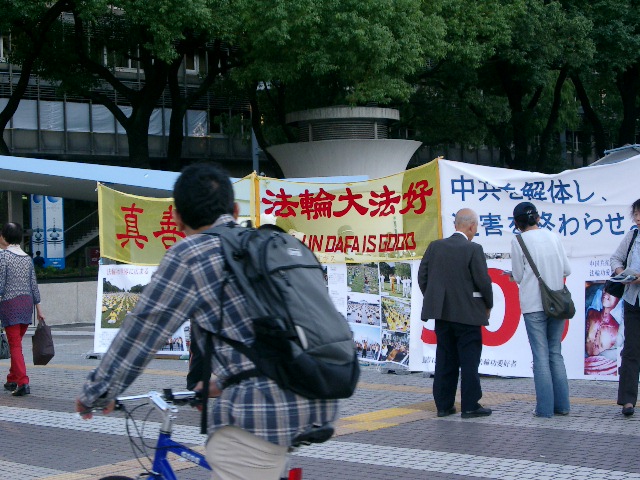 学员们打出了“法轮大法好”、“真善忍”和“解体中共,停止迫害”的日文横幅,并挂出法轮大法弘传世界、揭露中共活摘法轮功学员器官暴行等真相图片,吸引了很多过往行人的瞩目。