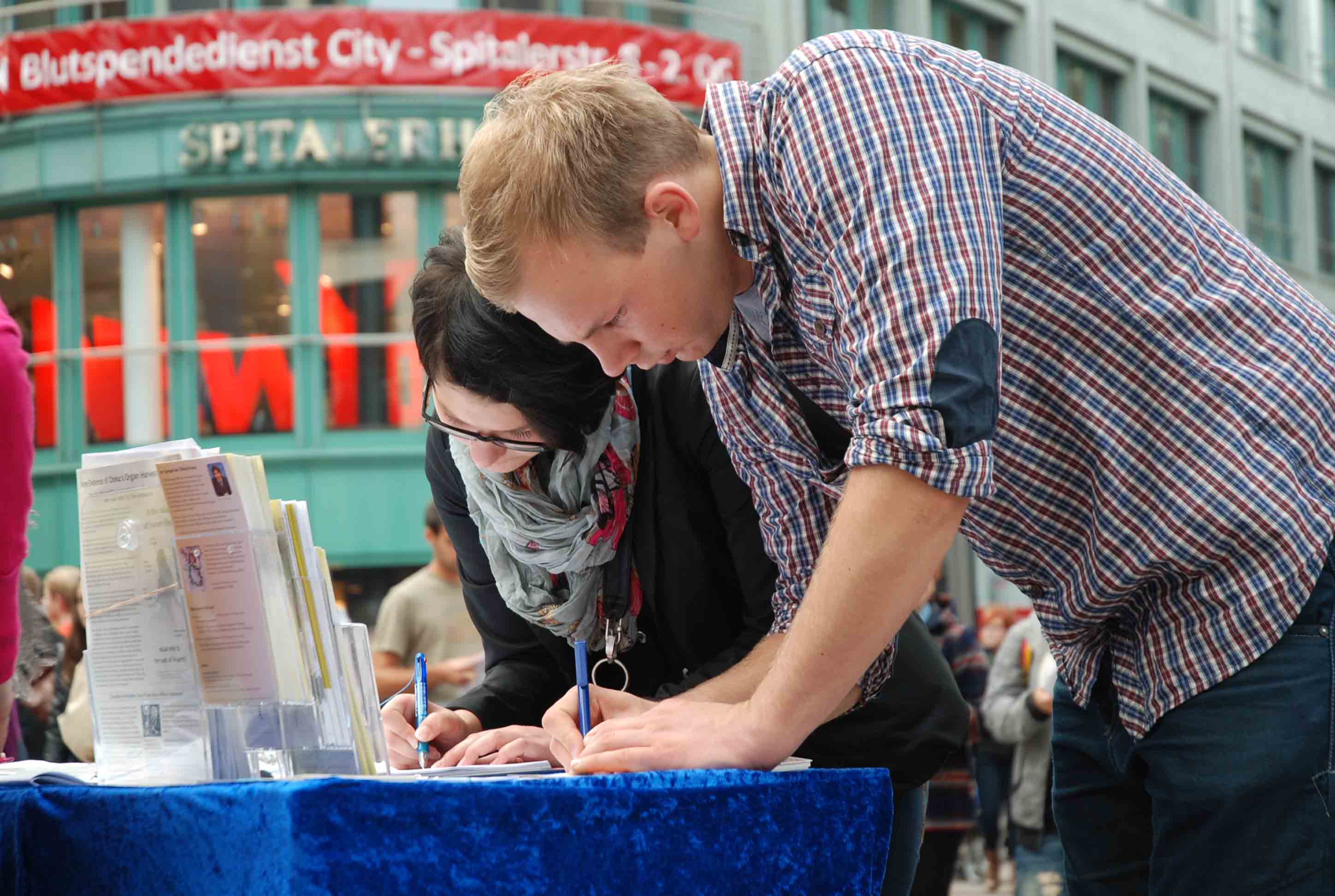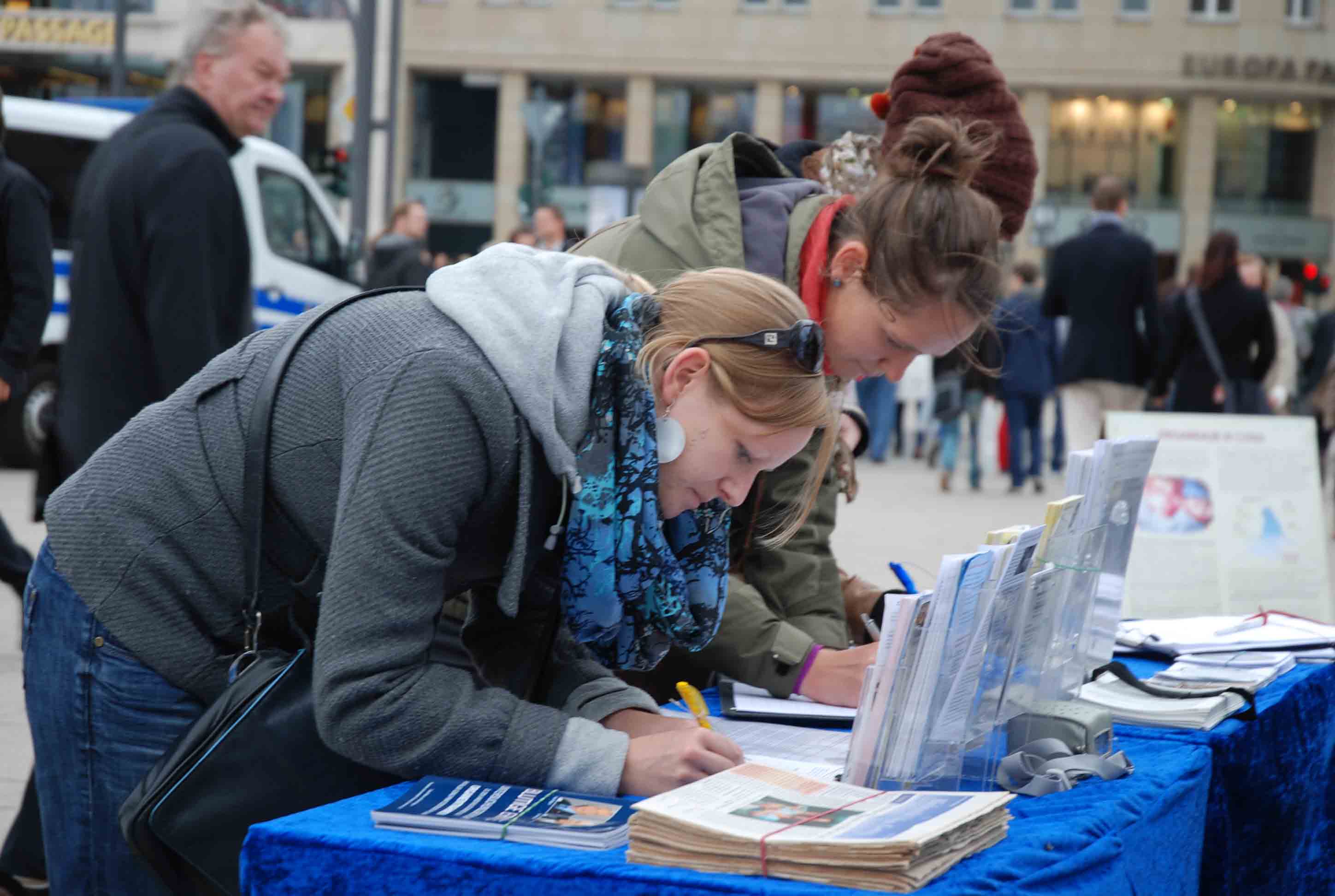 十月二十日的周六天气出奇的好,整个汉堡市中心的大小街道和步行街被游客、市民、街头艺人和各种信息展位填的满满当当。法轮功学员设在Spitalerstrasse上的征签桌和模拟手术台前驻足聆听和签字的路人接连不断,一群签了一群又来。