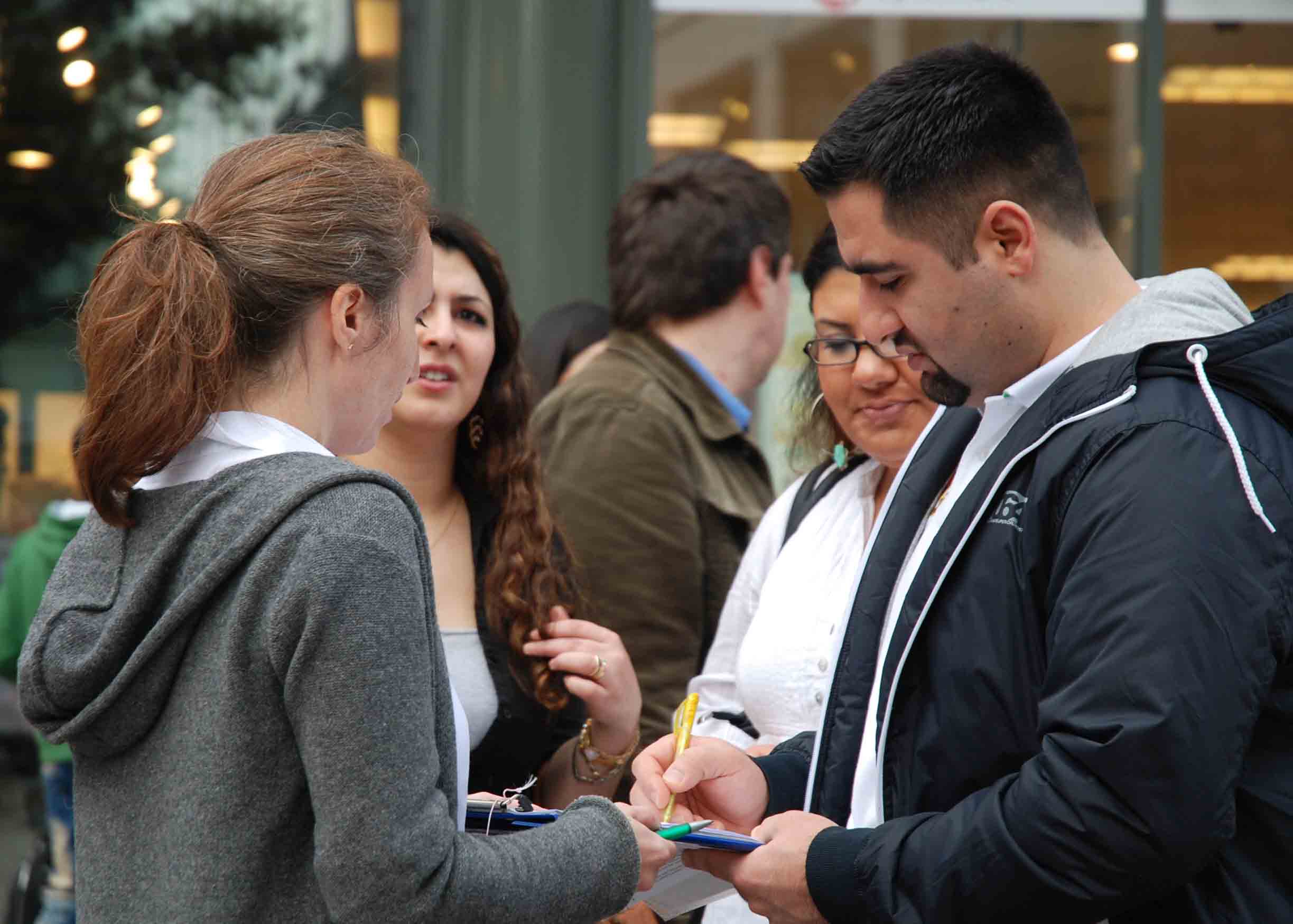 天色渐暗。征签活动到晚上六点结束。学员们开始收拾展位,广播里的女声继续向人们讲述真相。夜色中,依然断断续续的有人前来询问,拿过笔,就着一点光,认真地写下自己的名字。