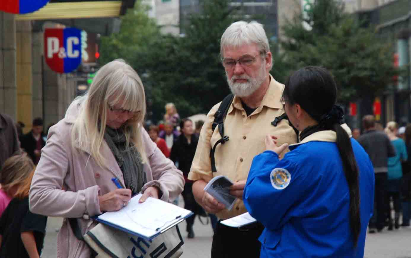 还有两个中国女孩儿问了许多问题。她们听说过法轮功被迫害的事情,可是从来不知道法轮功学员被活摘器官。她们问:“我们也可以签名吗?”
