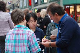 一位四十开外,高高瘦瘦,灰棕头发,身找米色长风衣的先生在边上观看模拟手术台很久。他听着广播里“(中共)总后勤部利用军队系统和国家资源,将法轮功学员验血编号,输入电脑系统……,统一关押,统一管理,成为国家级的活体器官库。” 不由皱起眉头。接过一张递上的传单,他马上读起来,整张读完后他抬起头,一动不动站立着,手里紧紧捏着传单。过了许久,他走向一个征签的学员,说,“我支持你们的呼吁”。表格的“职业”一栏里写着“医生”。