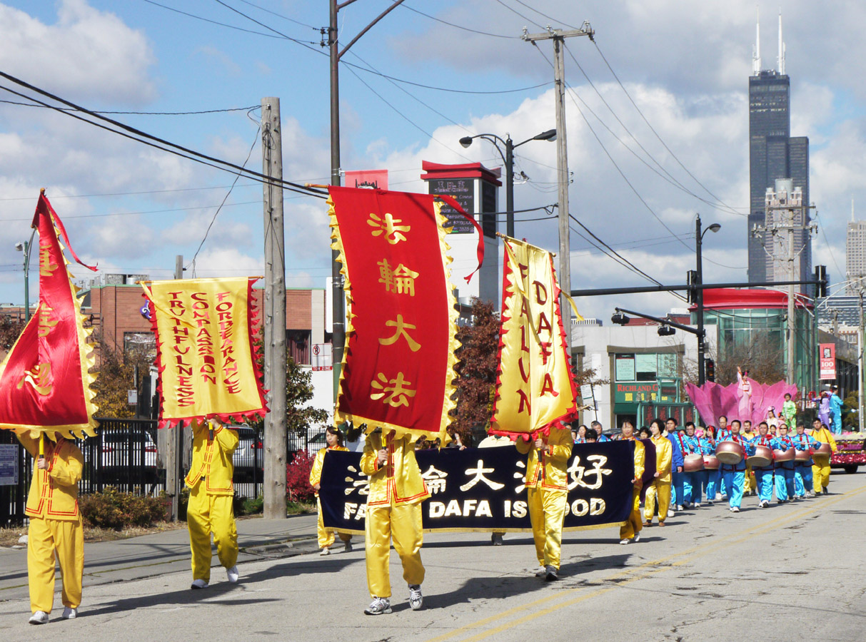 当日,秋高气爽,法轮大法,真善忍,中英文四面旌旗开路,唐鼓隆隆,跟随着华美的花车。一名芝加哥本地女士Cindy Kamp几年前在《芝加哥论坛报》上读到法轮功被迫害的新闻,这一天她恰好带孩子来中国城游玩,第一次真正看到法轮功游行,她说:“没想到(法轮功)有这么多人。”