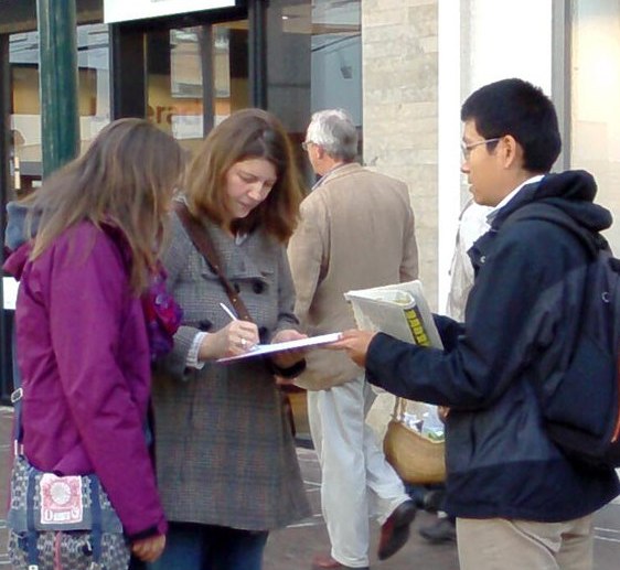 一对中年夫妇仔细看了征签表上的说明,先生问:“你现在做这件事情,恐怕回不了中国了吧?”学员说,目前恐怕是不能回去了。他又问:“我要是签了名是不是去中国也会有麻烦?”他的太太在一边说:“不应该怕它,没什么可怕的!”说着在征签表上签上了自己的名字。这位先生紧跟着也签上了自己的名字。