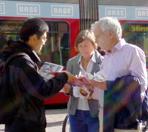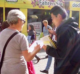 一个华人女孩和一个德国小伙子走向征签的学员,女孩用德语问:“需要我帮忙吗?”学员说在征签,呼吁调查中共活摘器官的罪行。女孩伸手接过征签表,看了看,用中文问:“你是中国人吧?我们说中文吧。”学员很吃惊,一问原来是个台湾女孩。她问:“到底发生了什么?”学员告诉她,中共活摘法轮功学员器官牟利,还将尸体做成标本出售,在大连就曾经有两家尸体加工厂。国外的尸体展览,可能大部分尸体都来自中国。女孩说:“我在台湾看过这个尸体展,还以为尸体都是来自德国呢,却原来是来自中国。这太恶心了,竟然有这样的事!”她在征签表上迅速签上自己的名字,并把他们的对话翻译给身边的小伙子。于是,小伙子也签上了自己的名字。