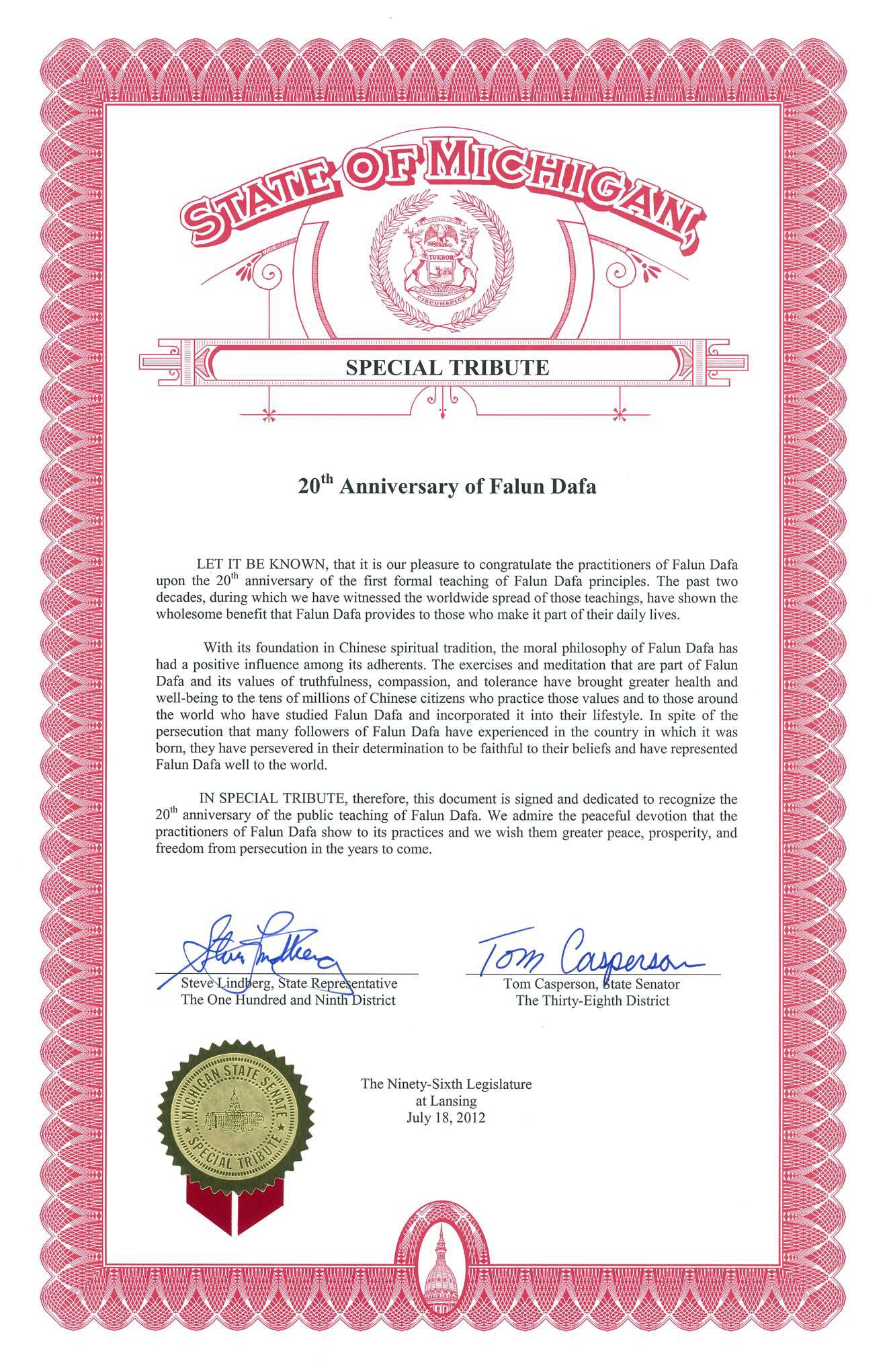 这份特别褒奖令旨在纪念这个特殊的日子。以此对法轮大法修炼者展现的和平,理性表达崇高的敬意,也祝福他们在以后的岁月中更加平和,顺利,免受迫害。