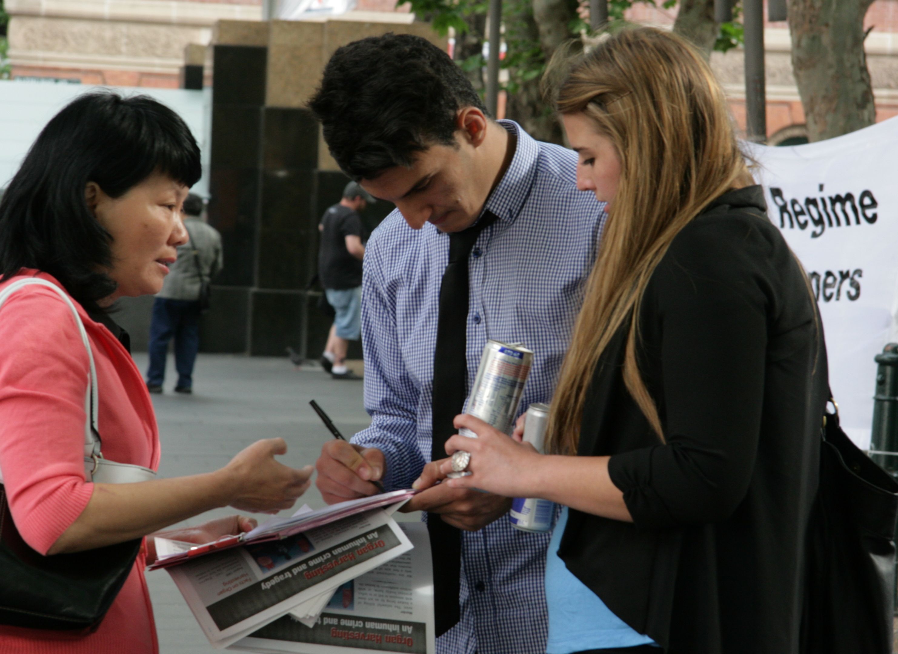 来自土耳其的肯•吐克伦(Can Tuklen)二十多岁,是悉尼大学的学生。他说:“我在学校时读过有关在中国人体器官被贩卖的文章,我了解在中国发生着什么。人不能坏到这份上。我很愿意帮助你们,我也很佩服法轮功的精神。”他边说着边签名。