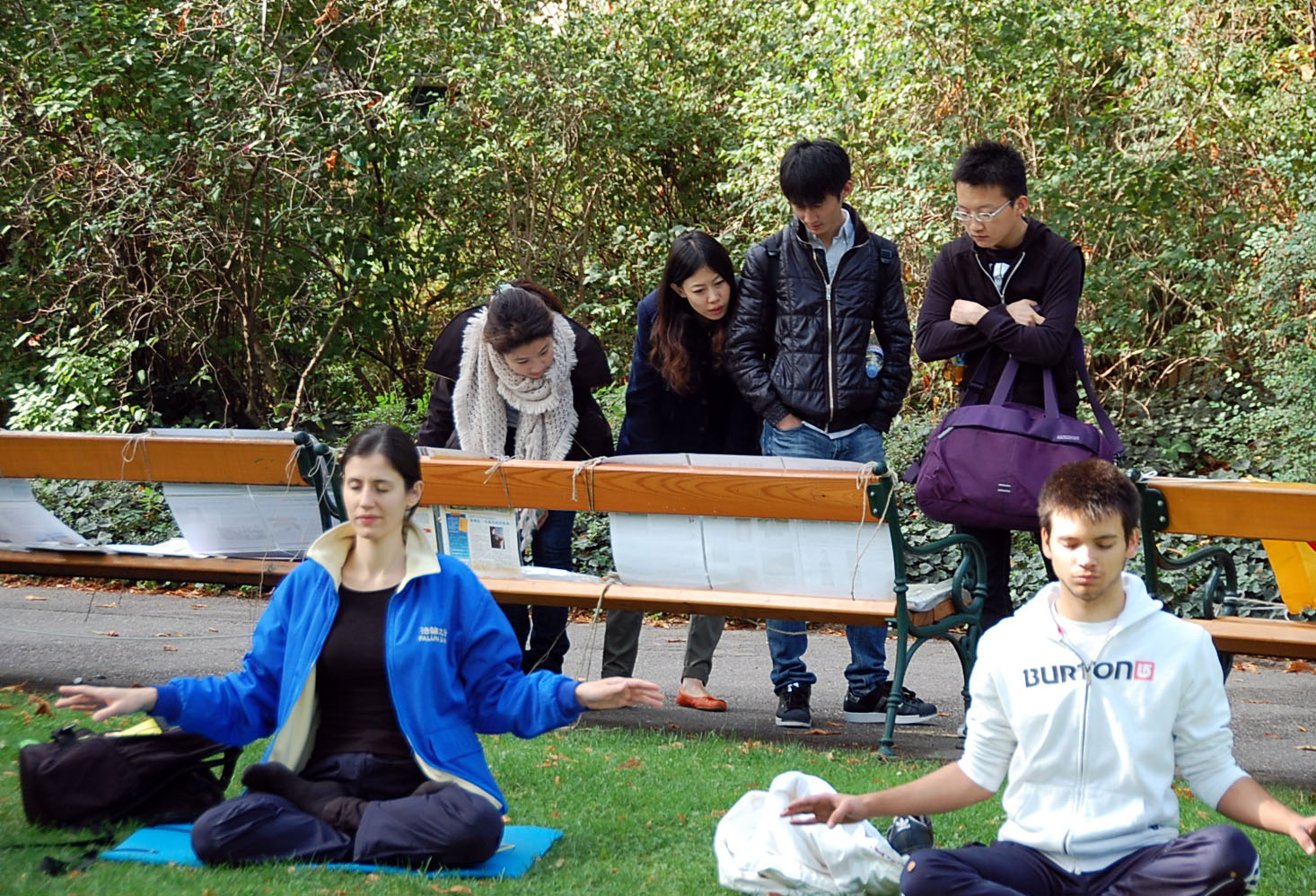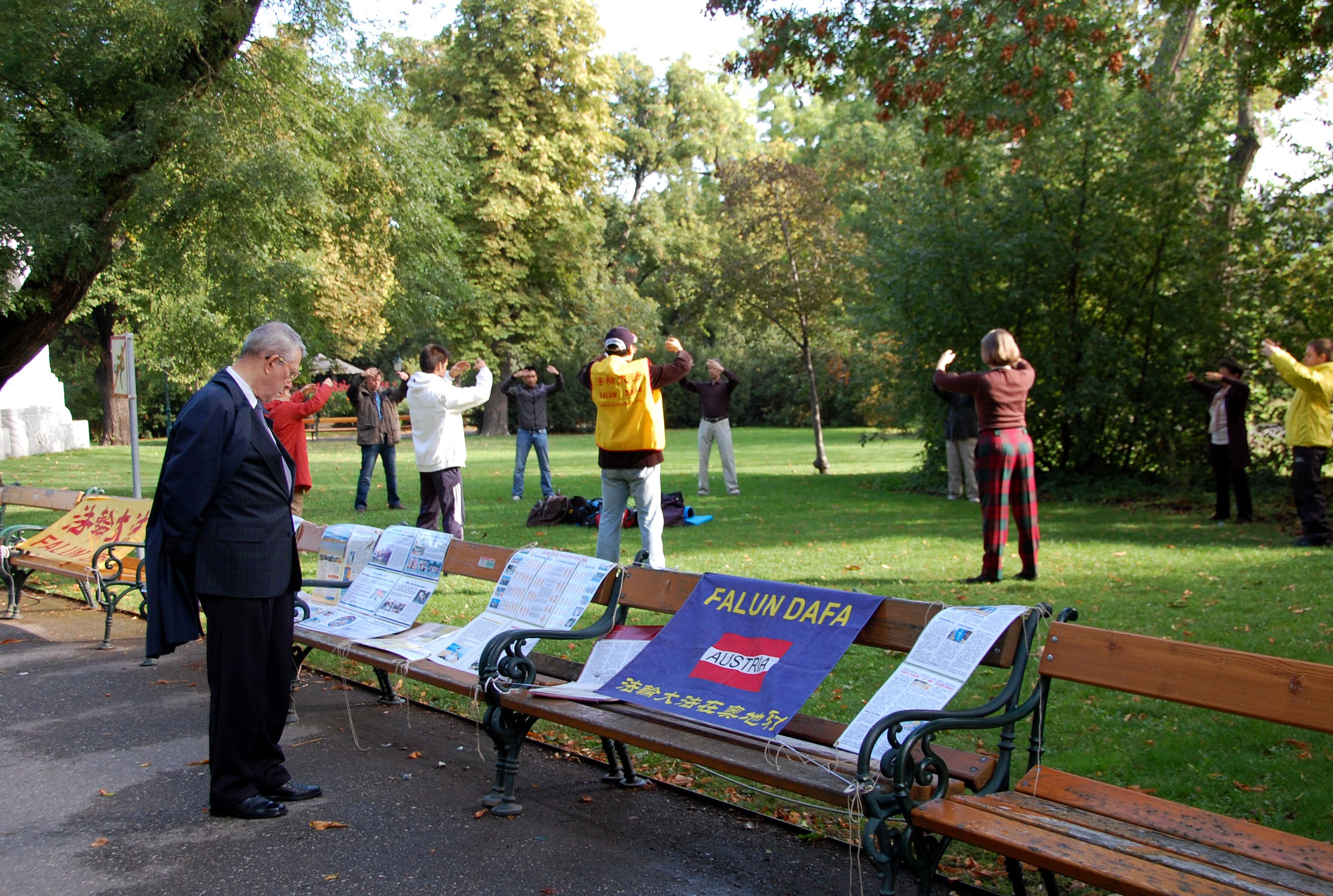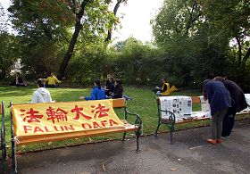 ![]() 中国游客经过维也纳城市公园的法轮功炼功点 |