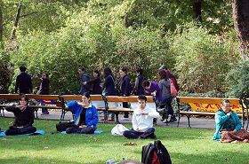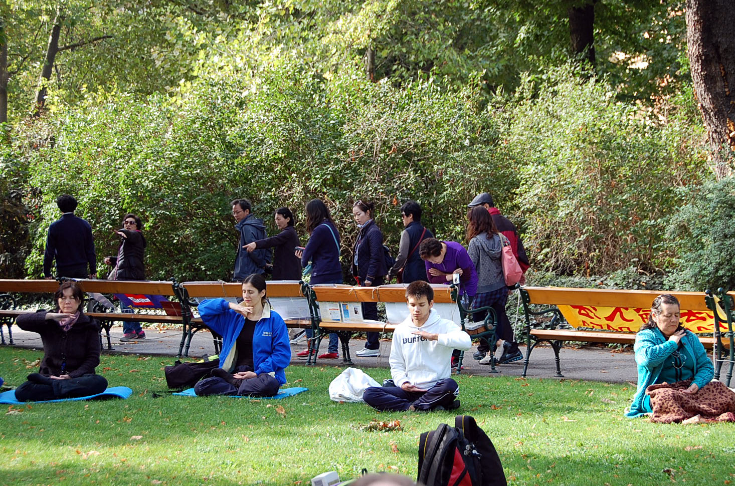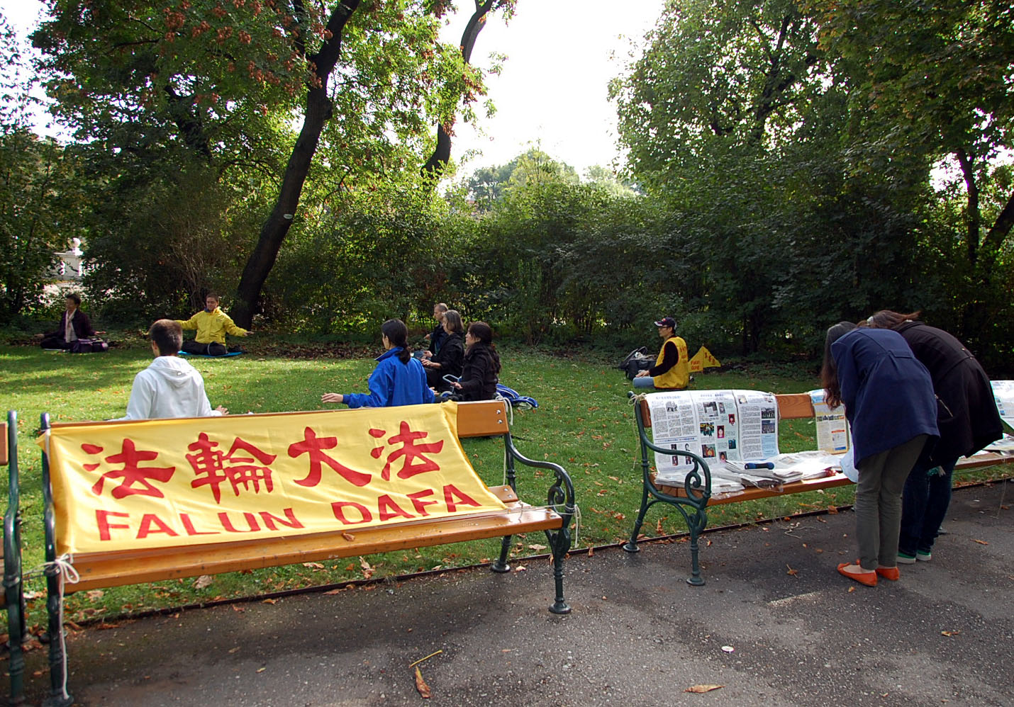 城市公园也是维也纳人喜欢和经常光顾的公园。自从二零零一年开始,散步的人们发现,在公园的草坪上多了一个炼功的团体,既有中国人,又有西方人,他们舒缓祥和的动作,吸引人们驻足观看。通过炼功人递给的传单,来公园的人开始知道了这个以“真、善、忍”为修炼原则的功法——法轮大法(又称法轮功)。
