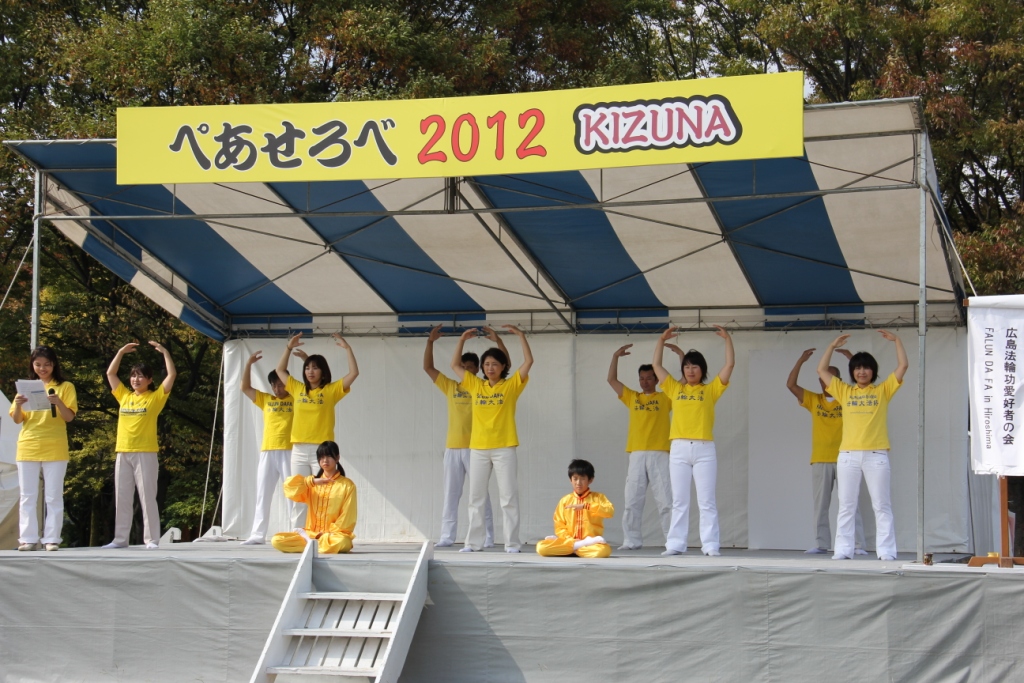 在活动中,拥有不同文化背景的团体设立展位介绍各自的文化。法轮功学员在展位上摆放了各种介绍法轮功(又称法轮大法)的真相展板和资料,并在舞台演示法轮功五套功法动作,观众中很多广岛在住的华人也聚精会神地观看了功法演示。当天不断的有不同国家的有缘人表示要到教功点来学功。