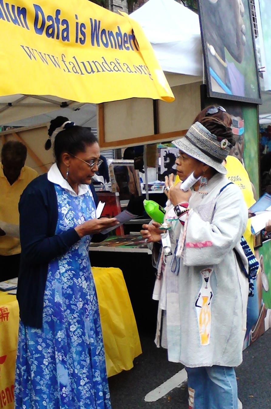 法轮功学员克兰润表示,今年和往年有很大的不同,往年大家要主动的走向人群去介绍,今年是一批一批的人流主动地来到我们的展位前。一部份人听说过法轮功,想要了解更多的信息,询问哪里有学功的地方;有些人是被美丽的展位吸引,他们表示第一次接触法轮功,大家都很高兴能拿到法轮功的真相传单。