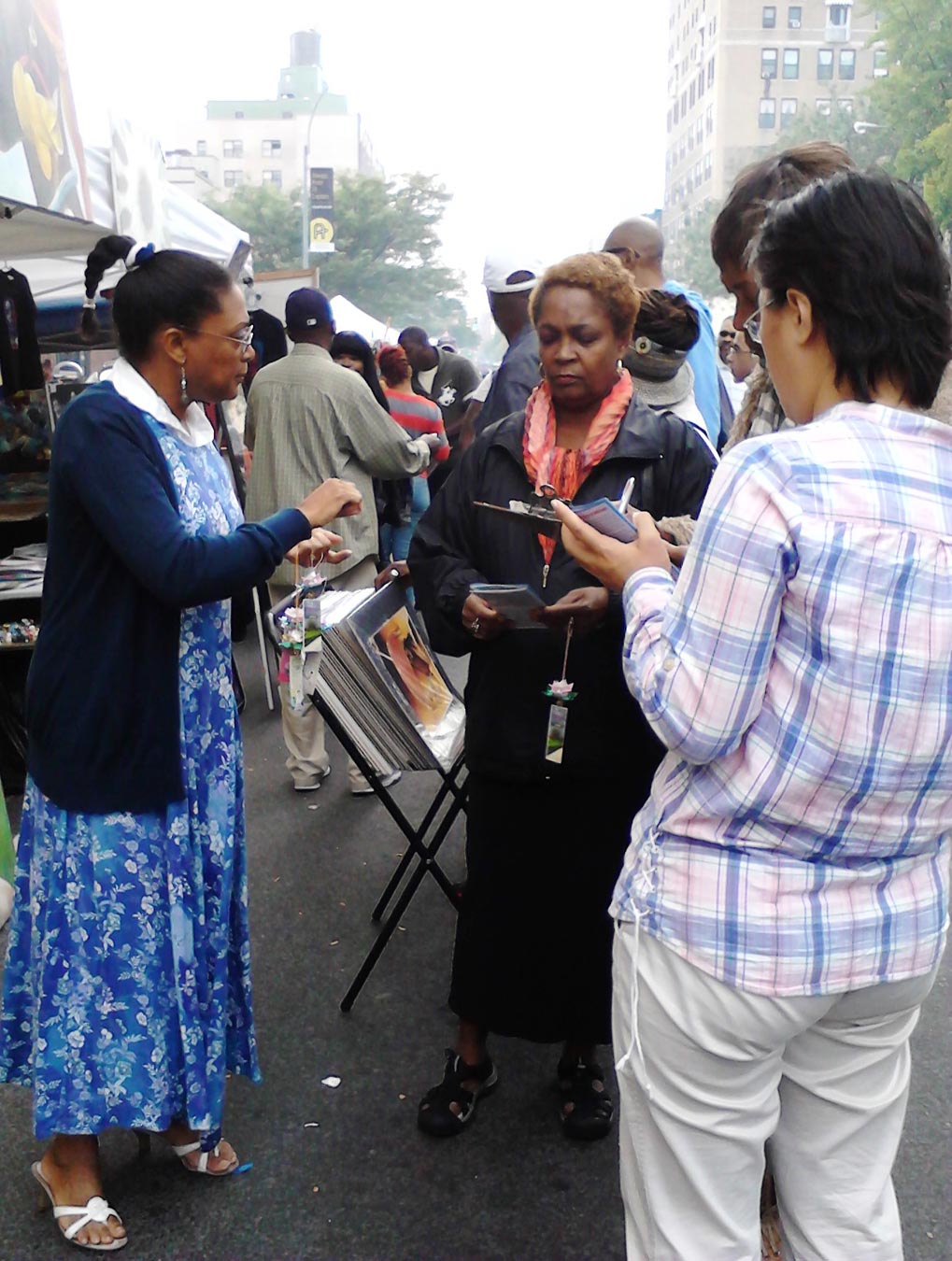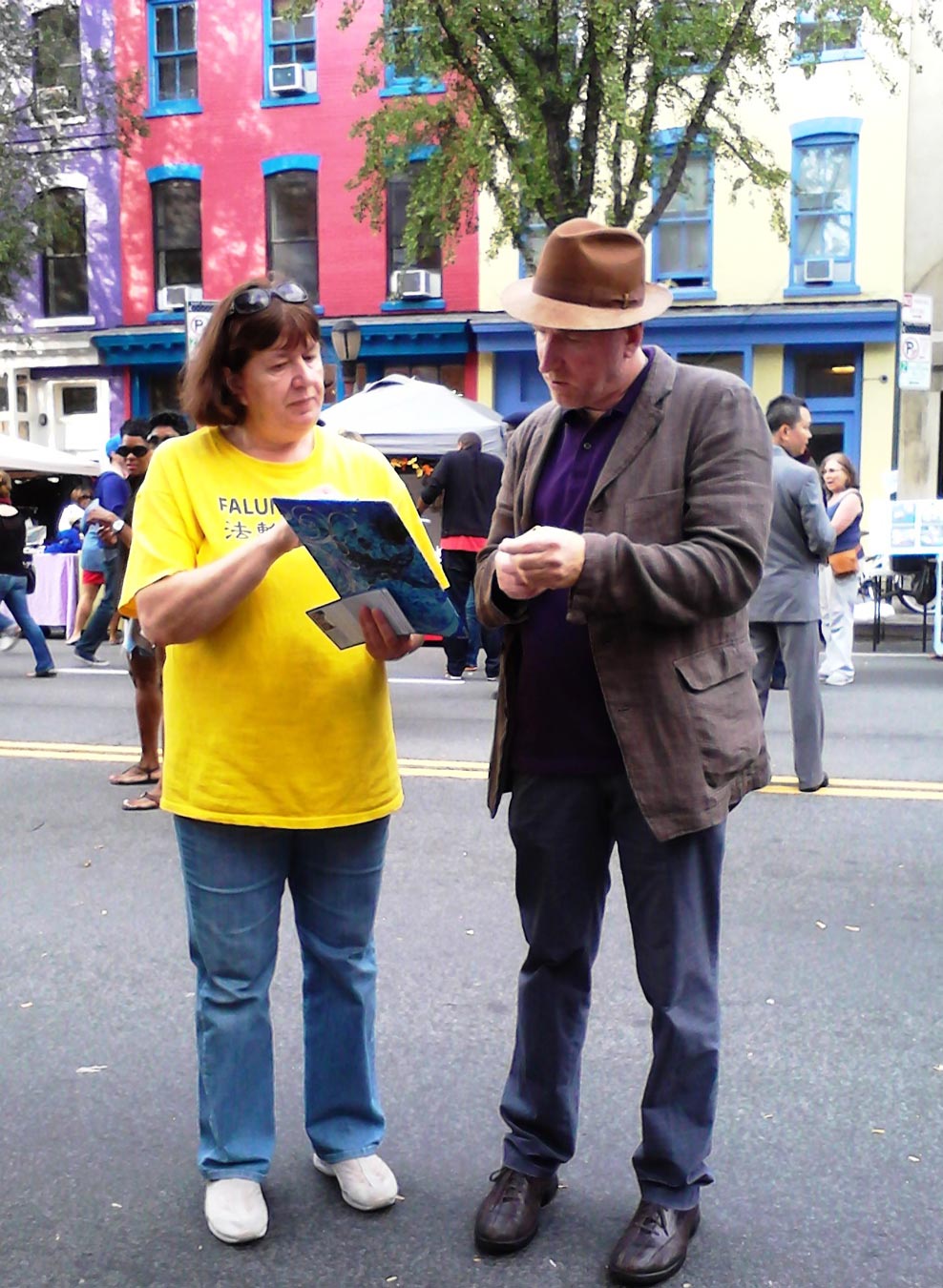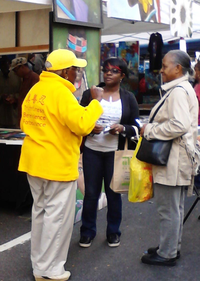 法轮功学员克兰润说:“展位前一直人流不断,很多人表示有兴趣要学功,这真是一个好现象。我们很高兴参加了这个市集,把‘法轮大法好’的福音带给了这么多众生,真是一件很开心的事。”