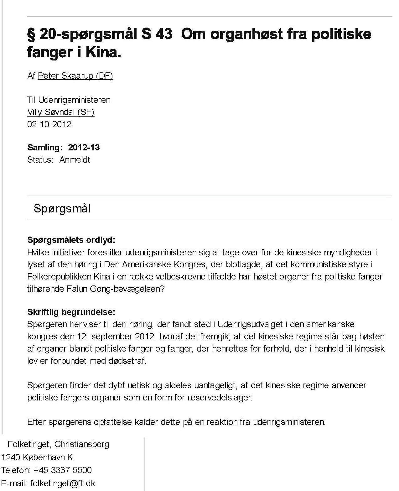 ![]() 丹麦议员彼得·斯高如普就中共活摘法轮功学员器官一事,向外交大臣提出质询(由丹麦国会官方网站公布) |