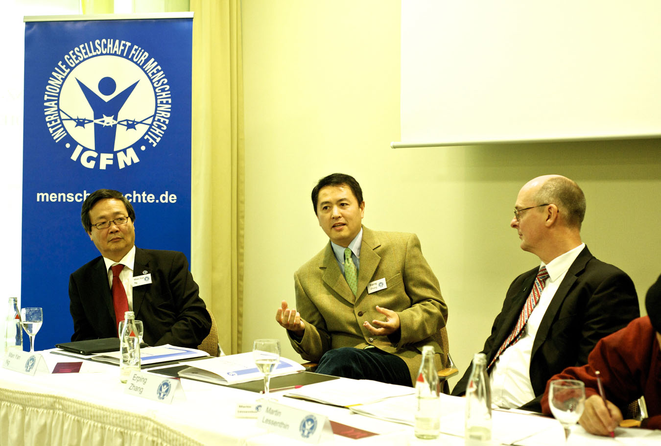 ![]() 德国国际人权协会开记者招待会揭露中共活摘法轮功学员器官,图为(从左至右)国际人权协会理事吴曼杨、法轮功学员张而平、国际人权协会理事会发言人莱森廷。(摄影:李青松) |
