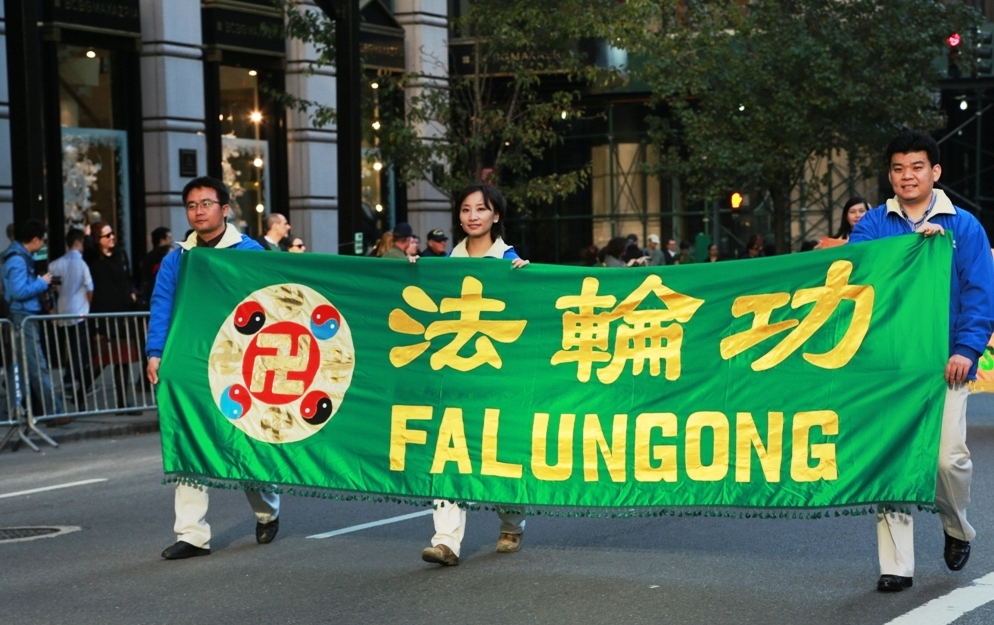 ![]() 二零一二年纽约老兵节游行中法轮功学员的队伍 |