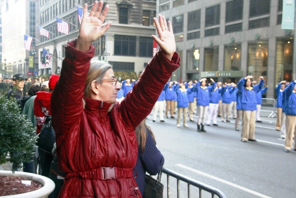 游行队伍途径之处,两旁观众掌声喝彩不断,许多观众纷纷举起相机拍个不停,有的还争相和法轮功队伍合影,其中不少是从中国大陆来美旅游的游客。还有一些跟着功法演示队伍学炼动作,来自布朗士区的费丽斯(Phyllis)女士就是其中的一位。